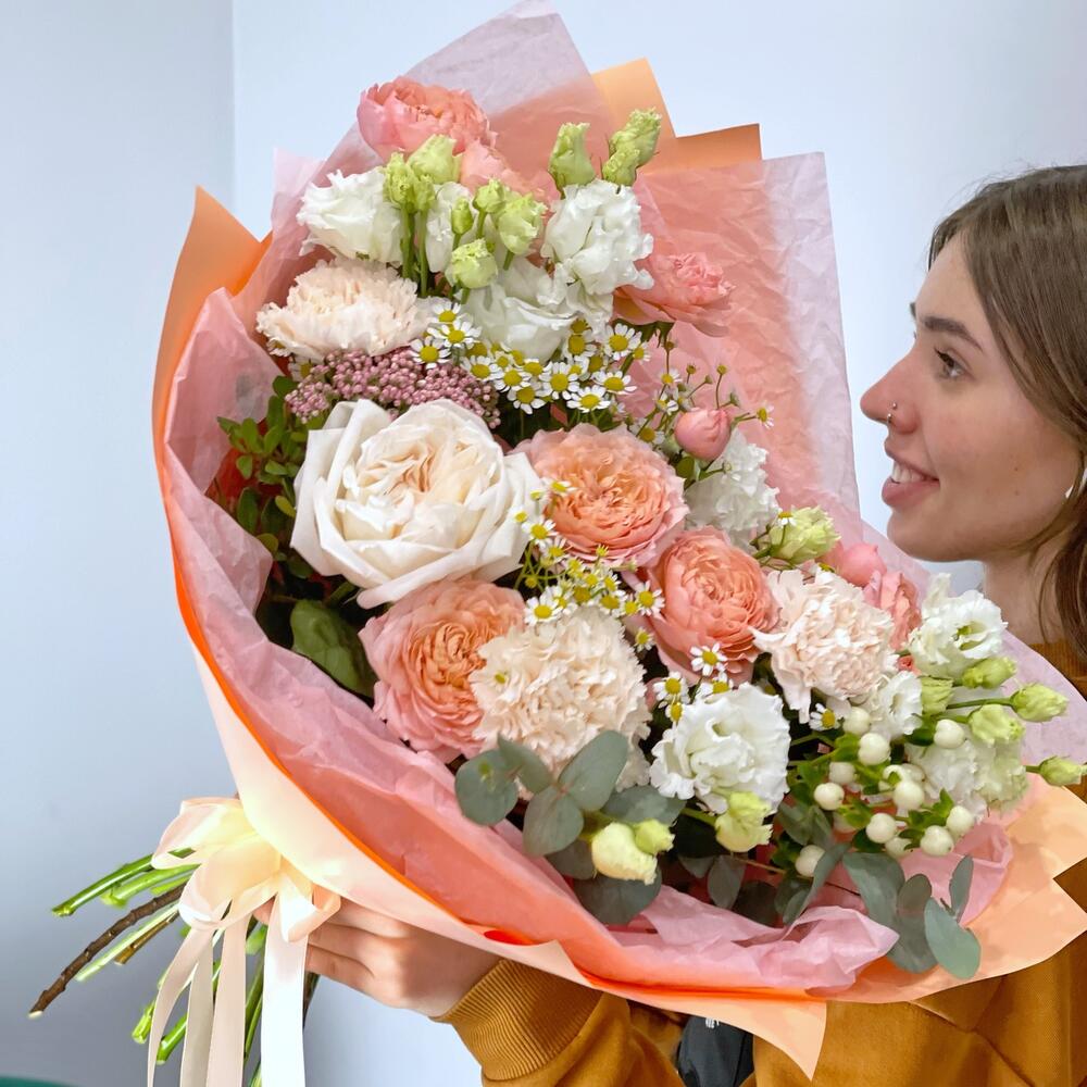 Букет в персиковой нежной гамме с очаровательными кустовыми пионовидными розами Джульетта, ароматными розами Вайт Охара, белыми лизиантусами и гвоздиками.Шикарный подарок на день рождения любимой девушке, маме, подруге.К каждому букету мы прикладываем:- открытку с Вашими пожеланиями- инструкцию по уходу за букетом- подкормку для цветов