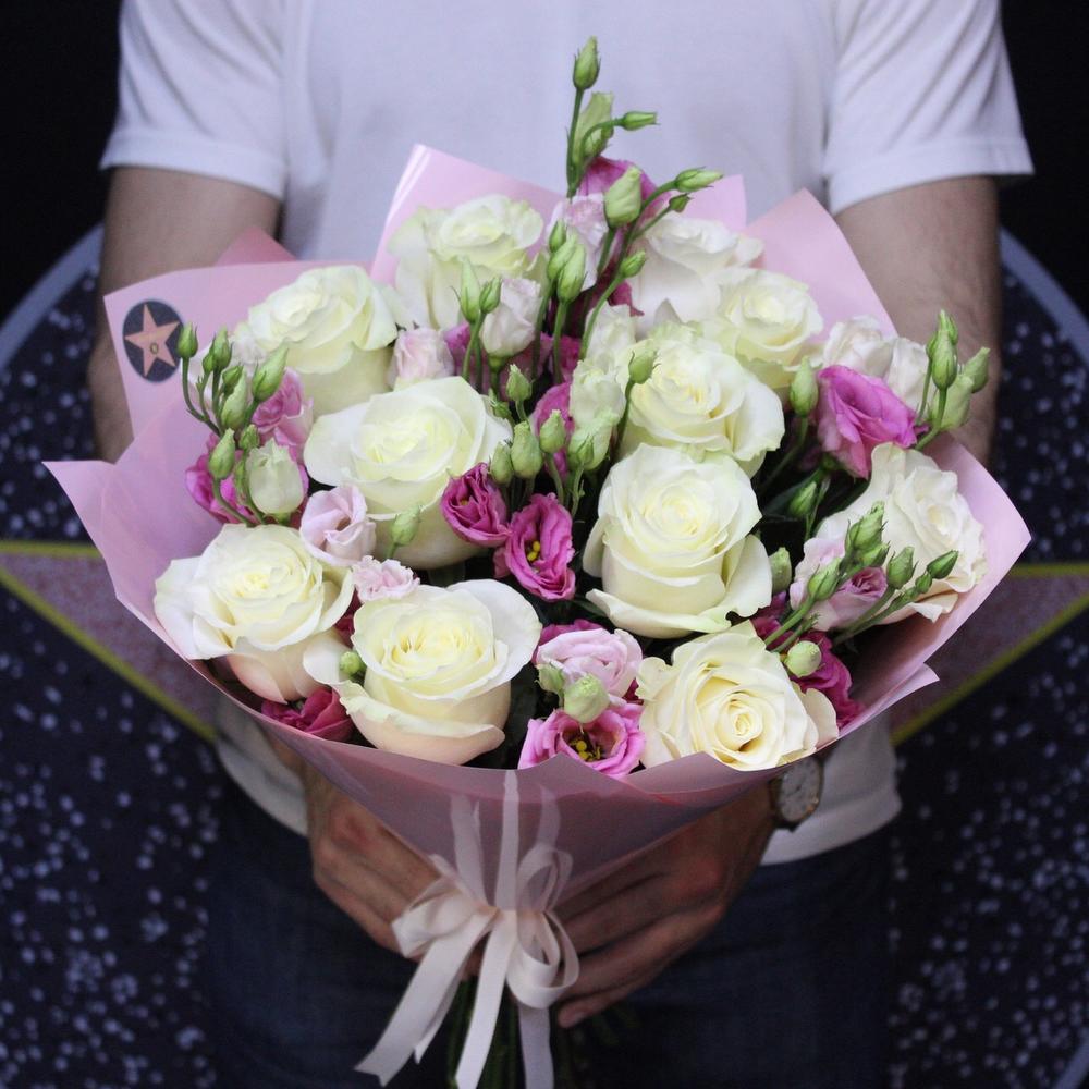 Роза премиум – 11 шт.Эустома – 7 шт.Пленка дизайнерская – 3 шт.Лента атласная – 2 шт.
