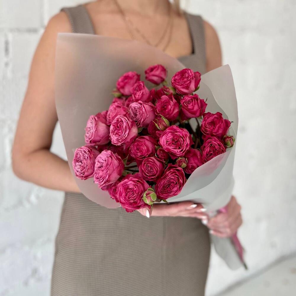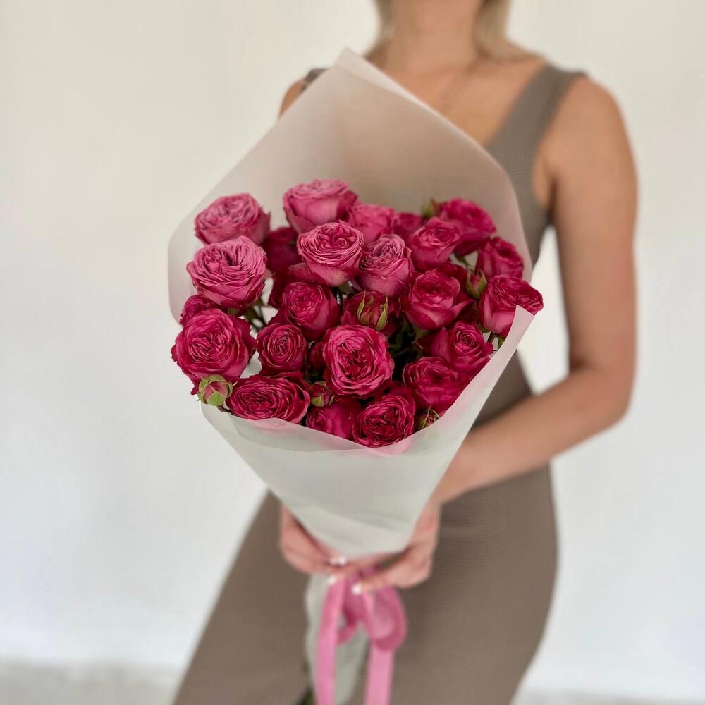 Роскошные пионовидные кустовые розы в дизайнерской упаковке