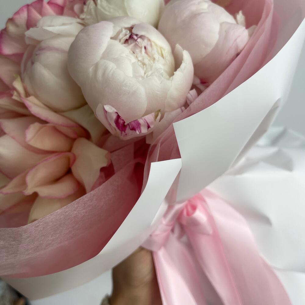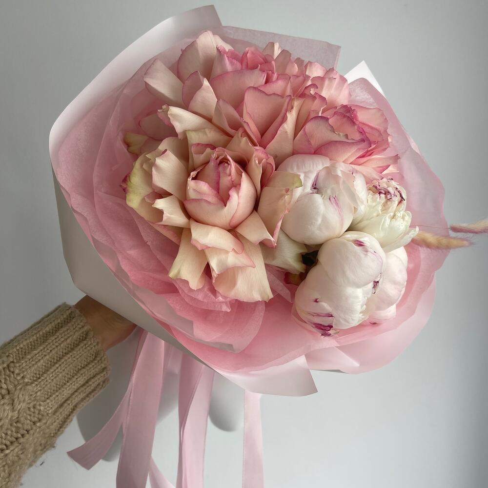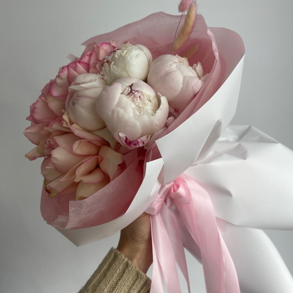 Пион – 4 шт.Тишью – 2 шт.Пленка – 4 шт.Роза французская – 3 шт.Лагурус (сухоцвет) – 3 шт.