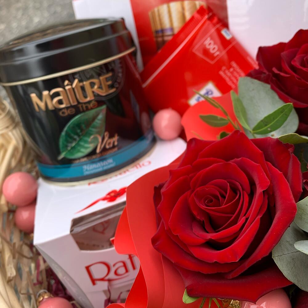 Конфеты Мерси – 1 шт.конфеты раффаэлло – 1 шт.Шоколад линдор – 1 шт.Шоколад риттер спорт – 1 шт.Чай в жестяной банке – 1 шт.роза или тюльпан – 5 шт.Оазис – 1 шт.Упаковка – 1 шт.Корзина – 1 шт.Декор – 1 шт.