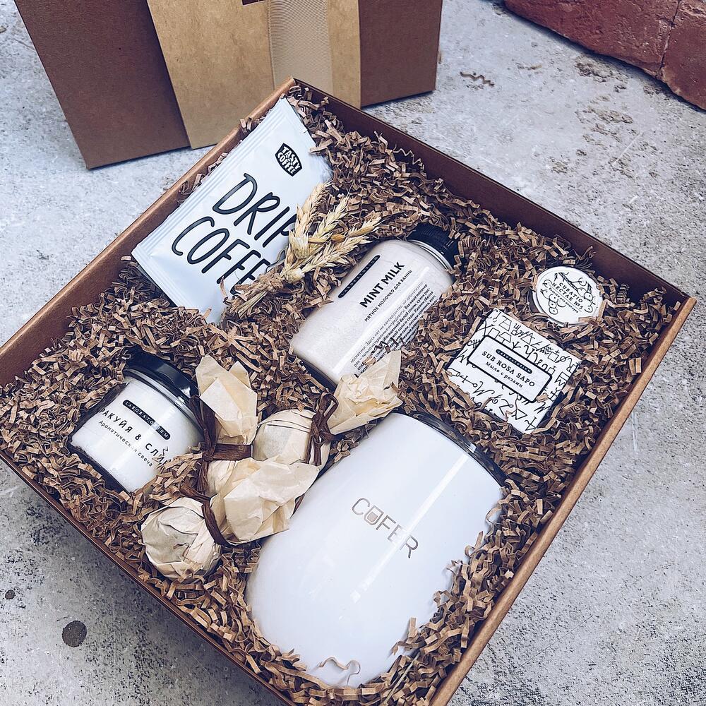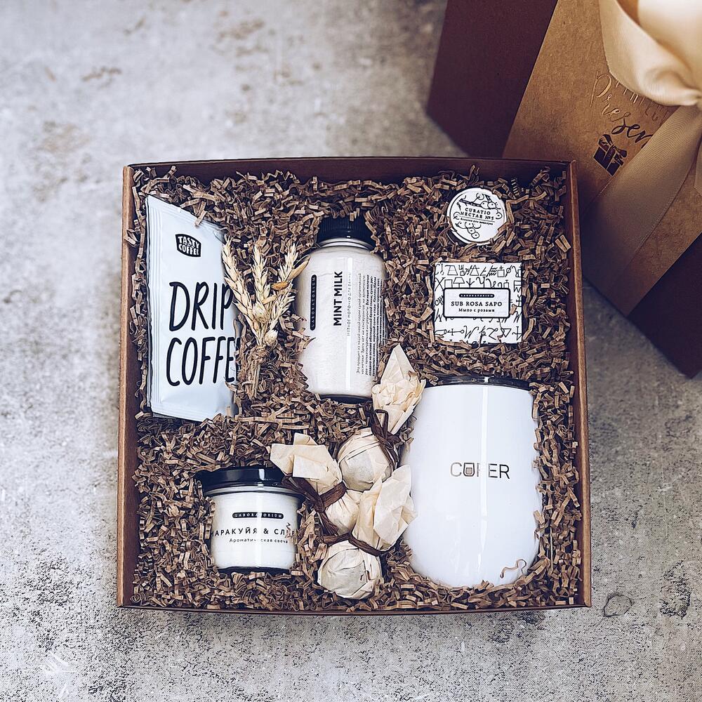 кофер для напитков 350мл – 1 шт.кофе в дрип-пакетах – 3 шт.молочко для ванной – 1 шт.бальзам для губ laboratorium – 1 шт.соевая свеча ручной работы – 1 шт.мыло с розами – 1 шт.конфетки ручной работы – 3 шт.Подарочная коробка – 1 шт.
