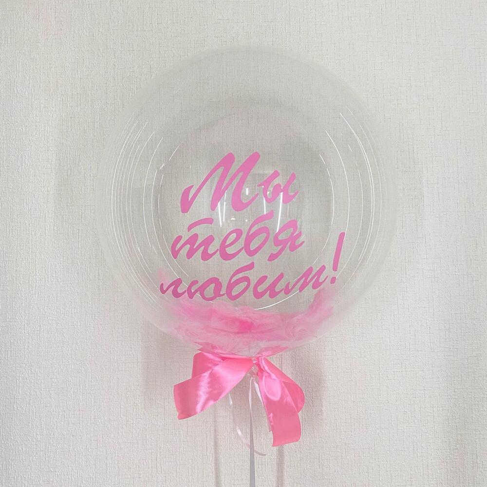 Прозрачный шар баблз с индивидуальной надписью, наполнение шара – перья , бант и атласная лентаРазмер шара в надутом виде 50-55смЦвет перьев и Наклейки можно изменить