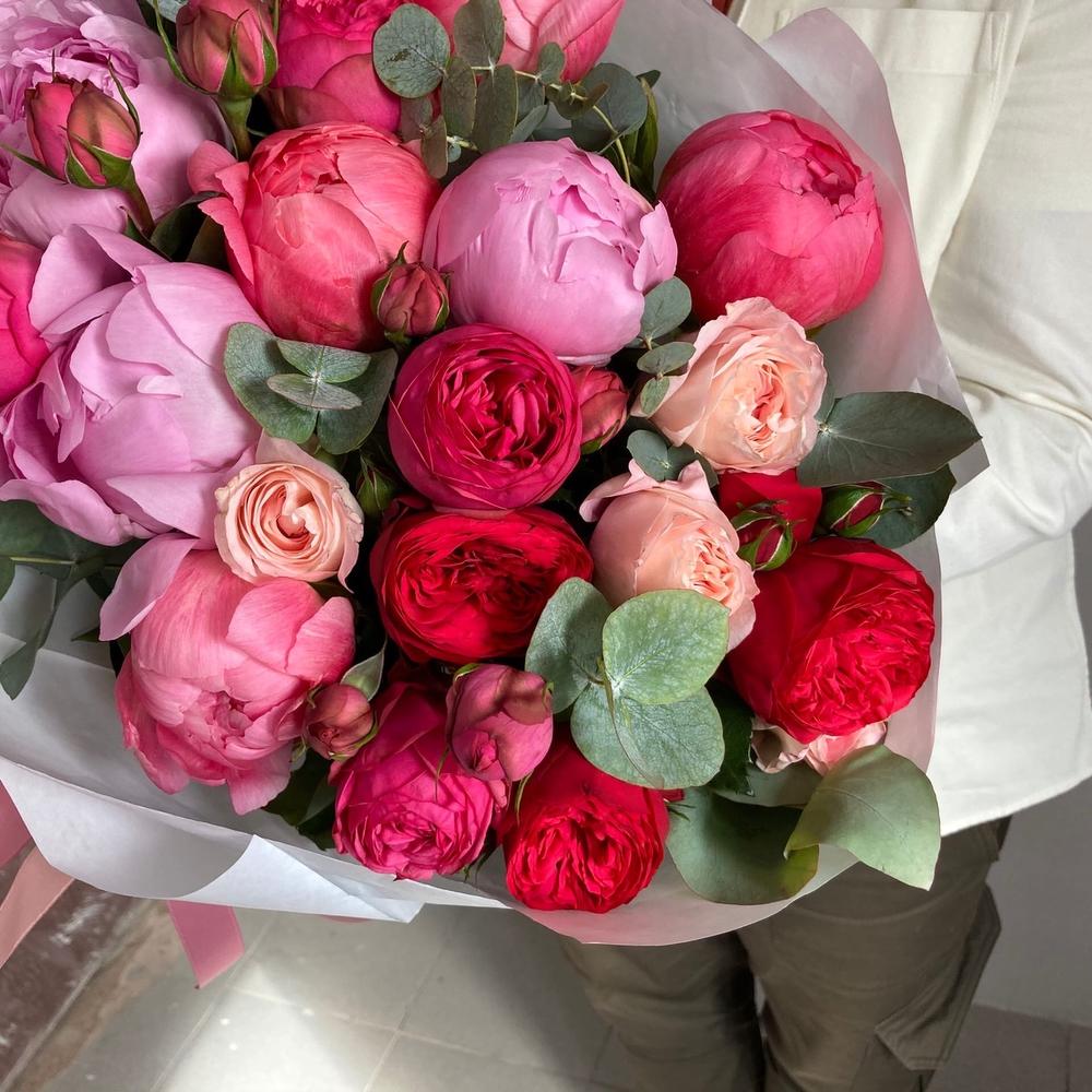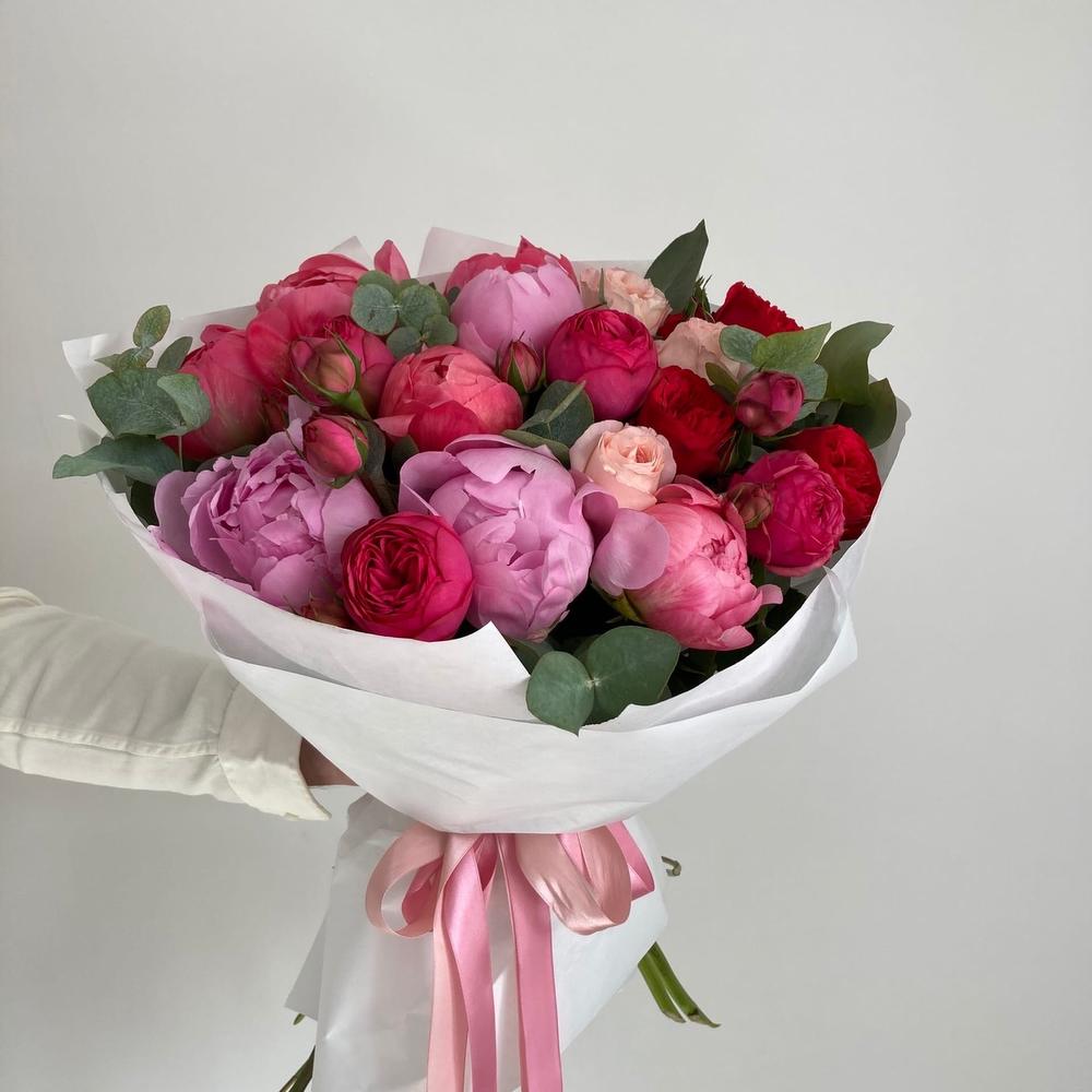 Букет с пионами, ромашкой и эустомой