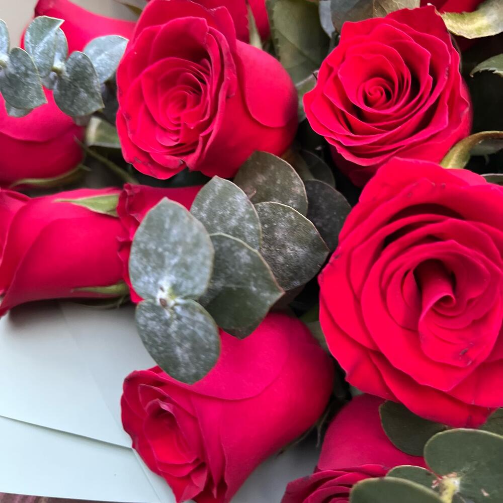 Эвкалипт – 5 шт.Лента атласная – 1 шт.Упаковка корейская пленка – 1 шт.роза кения красная – 15 шт.
