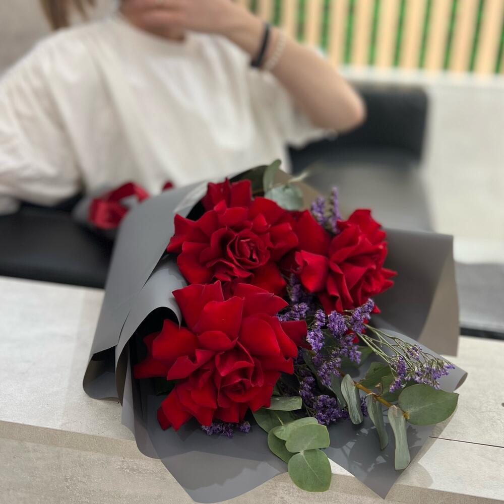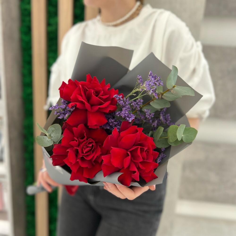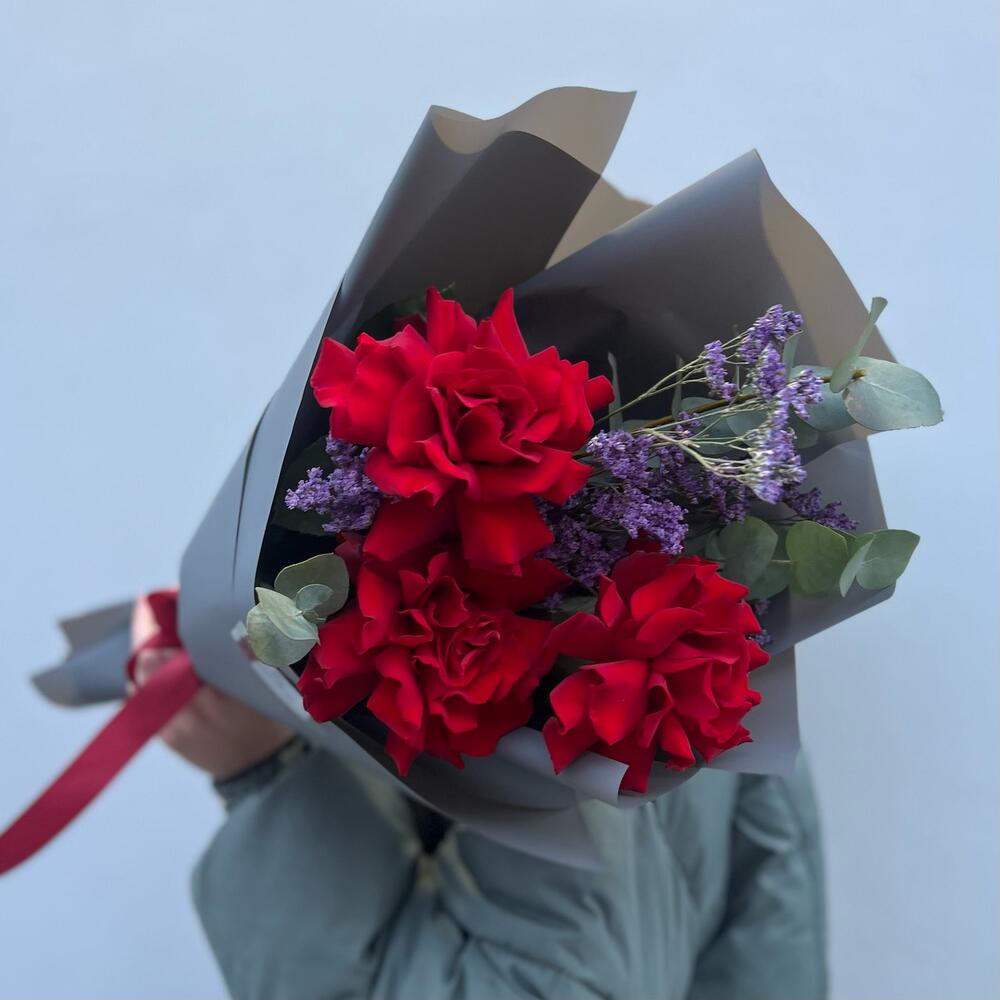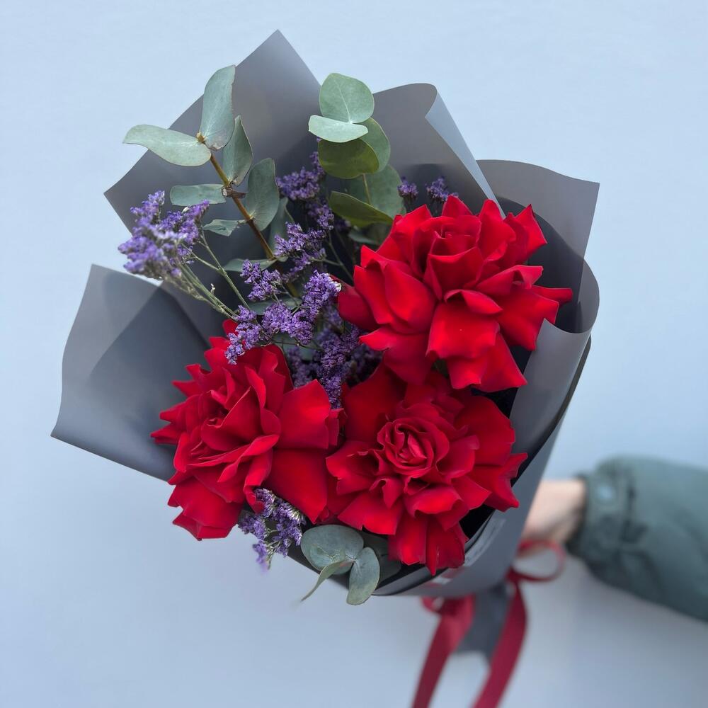 Лимониум – 1 шт.Эвкалипт – 1 шт.Лента атласная – 1 шт.Роза фридом – 3 шт.Пленка матовая – 1 шт.