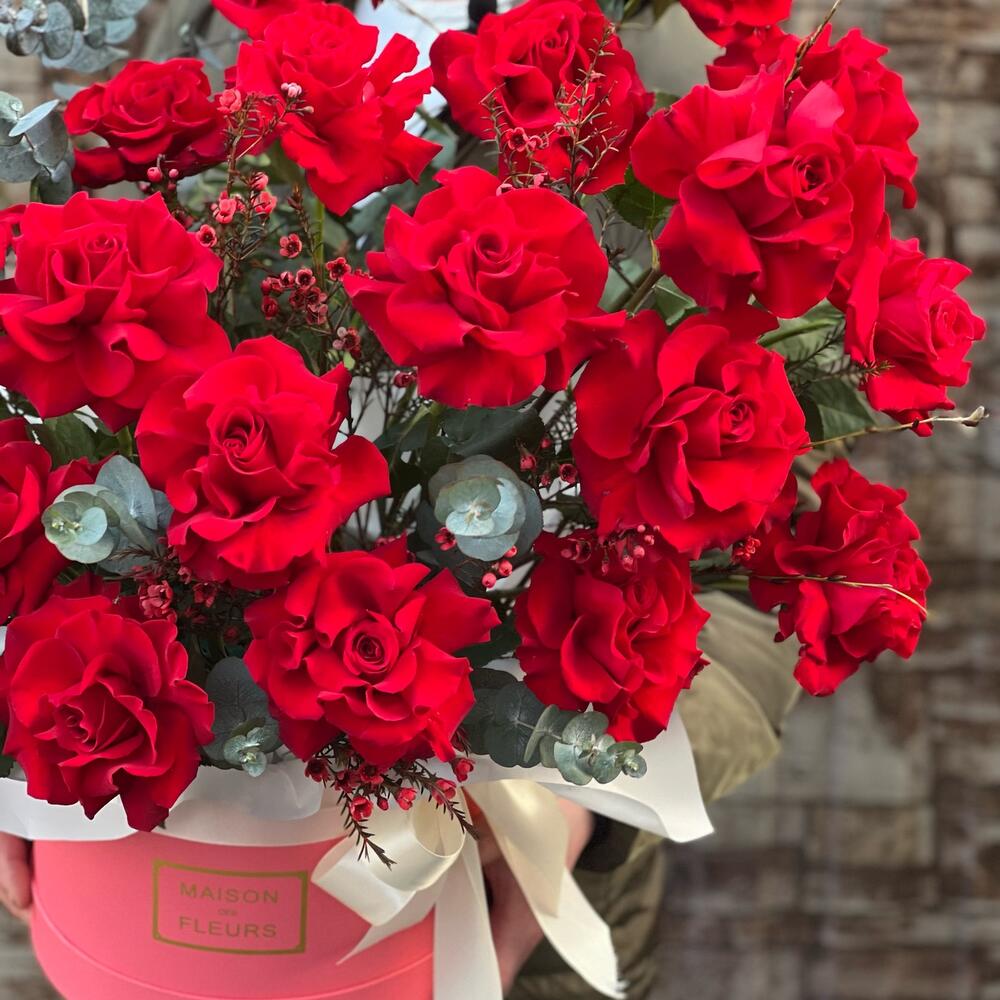 Шикарнейшая композиция из красных голландских роз в сочетании с эвкалиптом, хамелациумом и различной зеленью очарует и поразит кого угодно