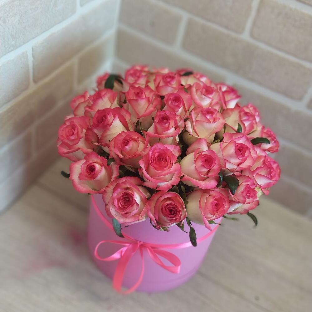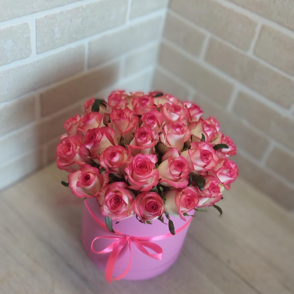 Лента атласная – 1 шт.Коробка шляпная – 1 шт.Роза Джумилия – 29 шт.Оазис флористический – 1 шт.