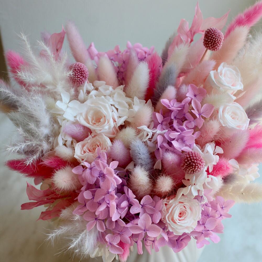 Роза одноголовая – 5 шт.Гортензия – 2 шт.пушистики – 1 шт.Керамическое кашпо – 1 шт.
