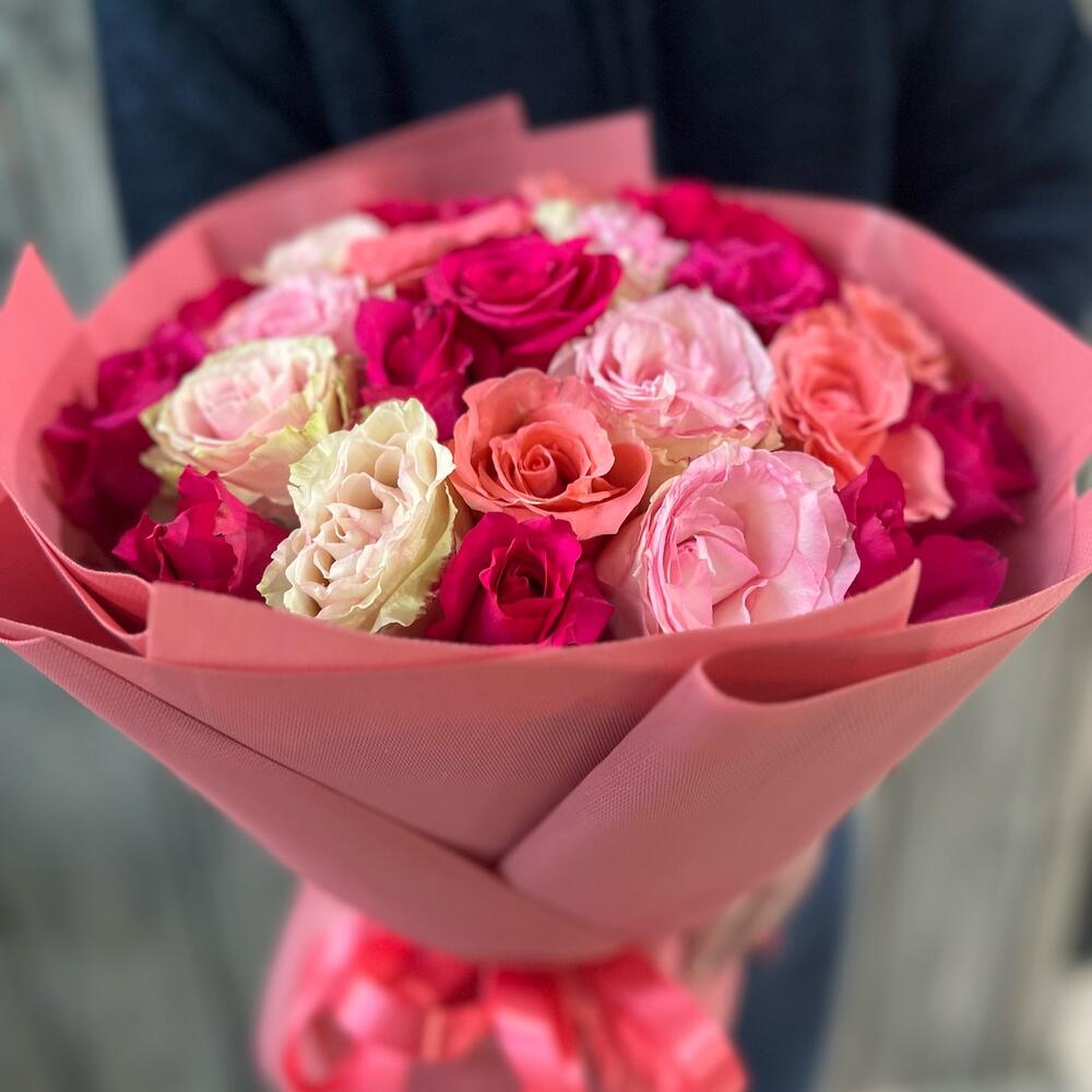 Розовый микс из 21 розы в фирменной упаковке