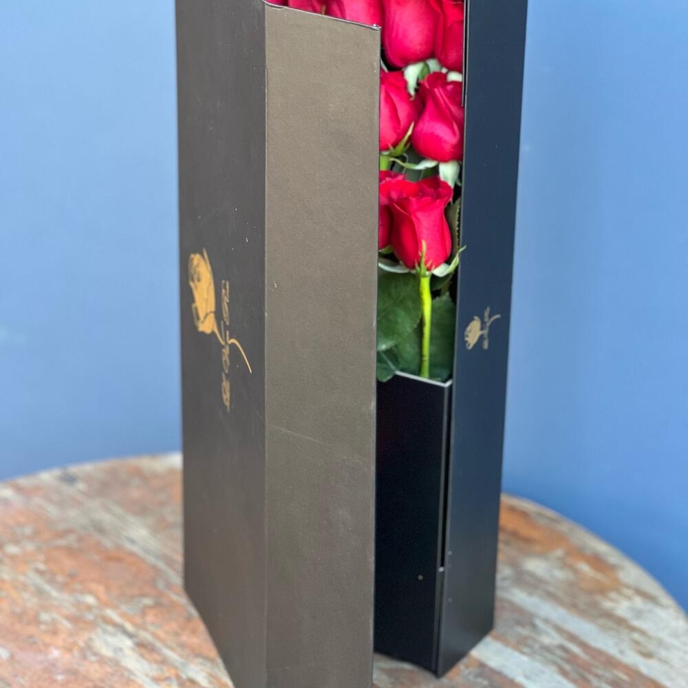 Лента атласная – 1 шт. Роза голландия – 15 шт. Оазис флористический – 1 шт. Футляр – 1 шт.