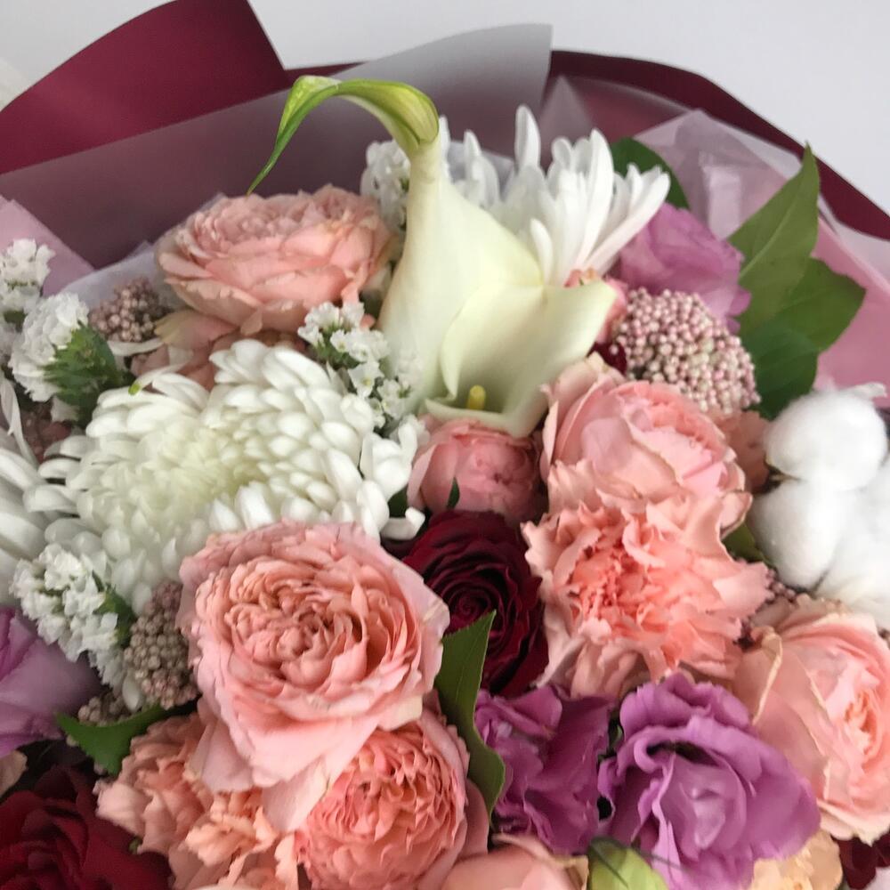 Роза Джульетта – 3 шт.Хризантема – 5 шт.Гвоздика – 5 шт.Эустома – 3 шт.Хлопок – 2 шт.Салал пучок – 1 шт.Роза красная – 5 шт.Калла – 1 шт.Тишью – 2 шт.Пленка дизайнерская – 4 шт.