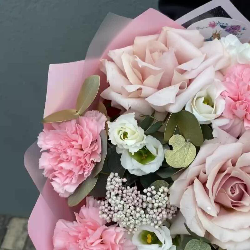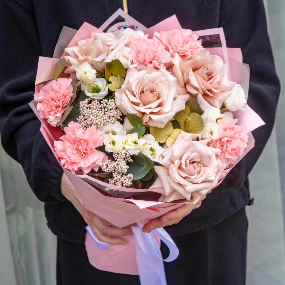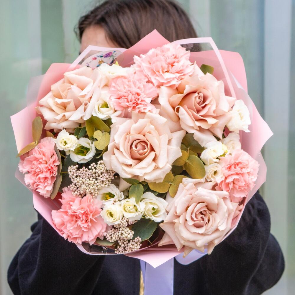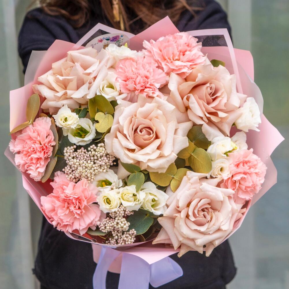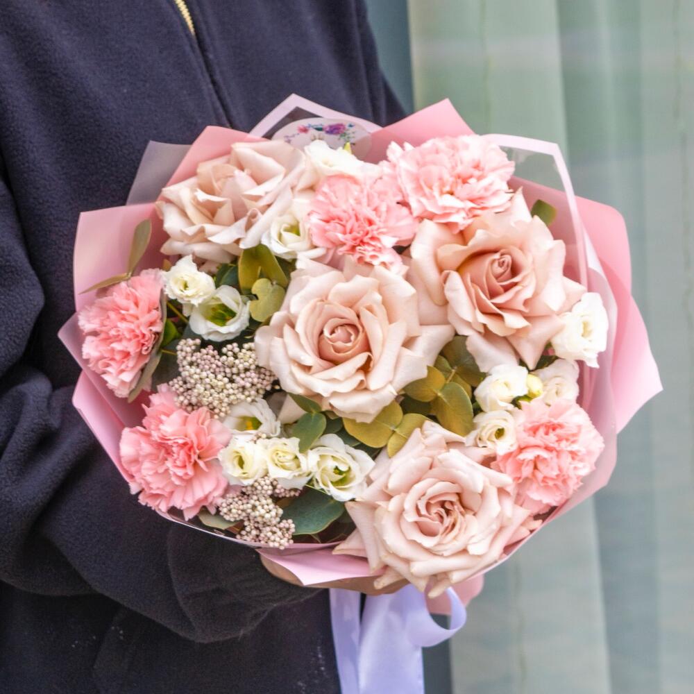 Сборный букет с французскими розами и гвоздикамм в пудровых оттенках