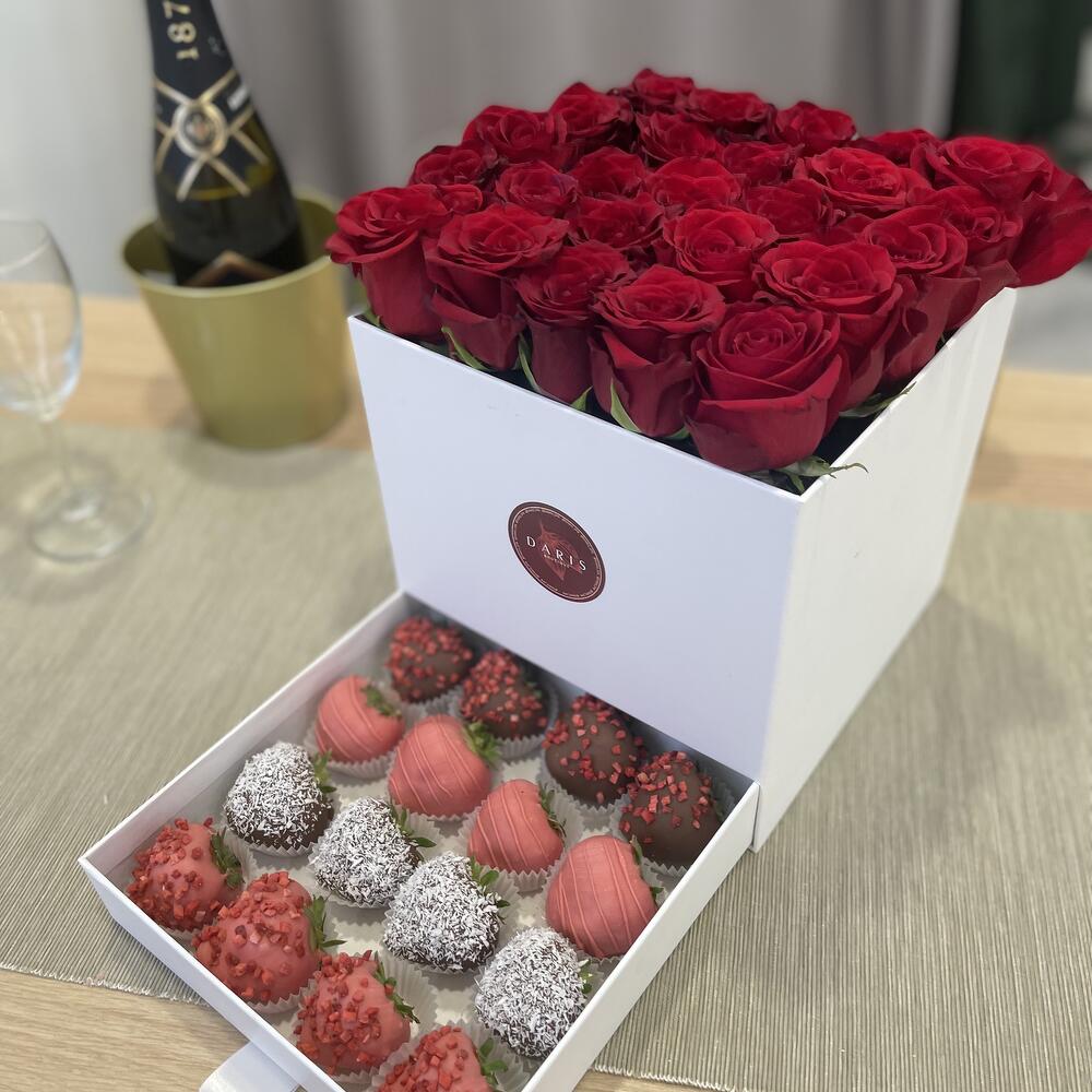 Шкатулка с кустовыми розами и клубникой в шоколаде