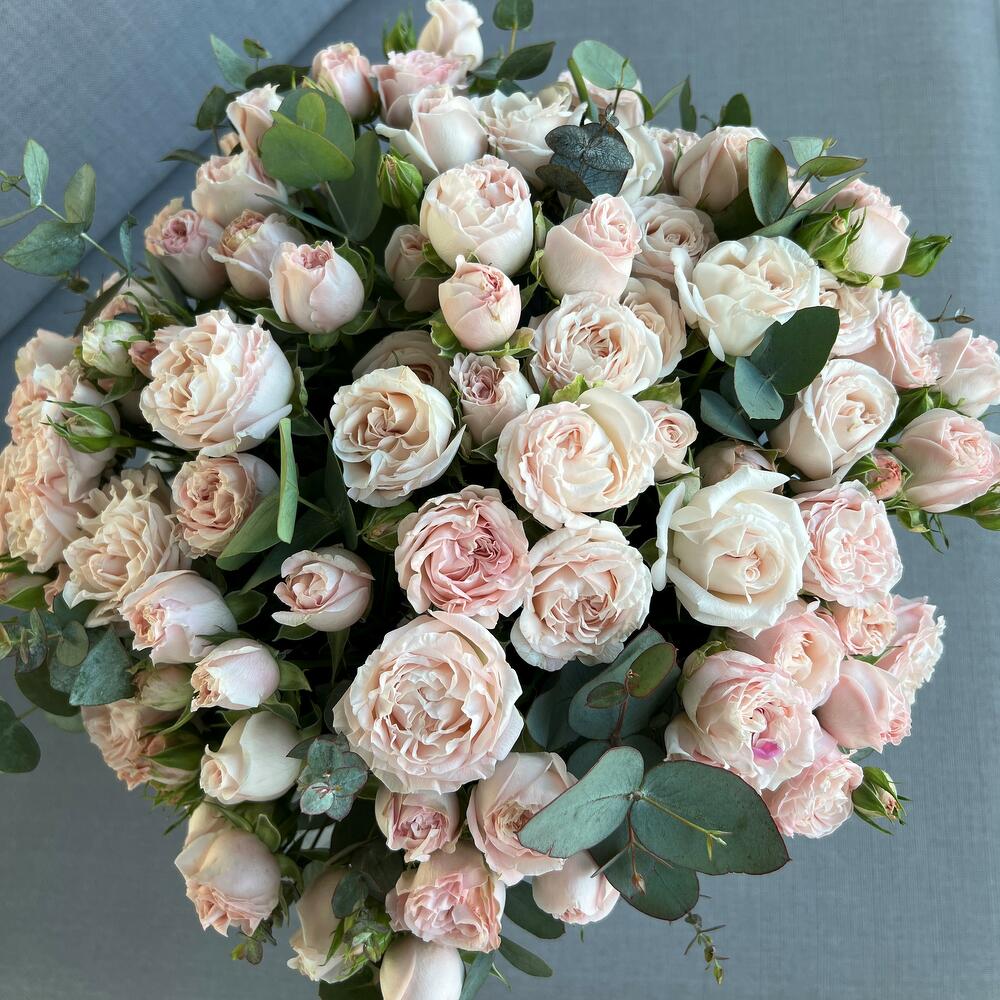 Кустовая роза – 19 шт.Эвкалипт – 4 шт.Шляпная коробка – 1 шт.