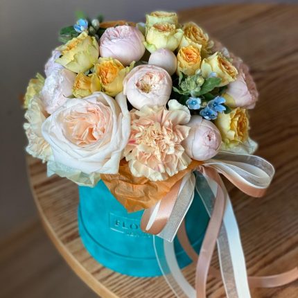 Пионовидная роза – 2 шт. Кустовая роза – 5 шт. Тюльпан – 2 шт. Гениста – 2 шт. Роза одноголовая – 2 шт. Эвкалипт – 1 шт. Гиацинт – 1 шт. Оазис – 1 шт. Сумочка – 1 шт. Открыточка с вашими пожеланиями – 1 шт.