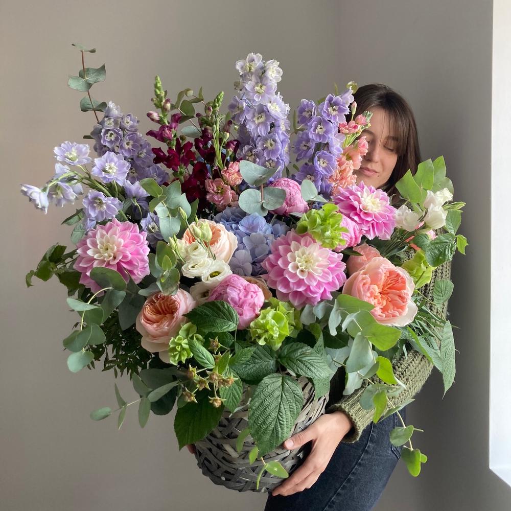 Душистая, садовая корзина с дельфиниумом, георгинами, гортензиями, пионовидными розами, маттиолой, львиным зевом, ирландскими колокольчиками, малиной и эвкалиптом.