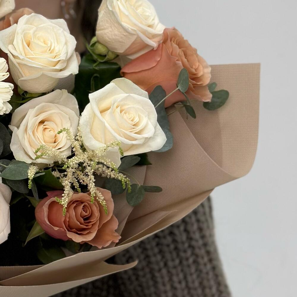 Флористы из студии “Varda Flowers” подобрали свежие и красивые цветы для создания букета, который наполнен положительными эмоциями и любовью. Они тщательно расположили каждый цветок в букете, учитывая его форму и цветовую гамму, чтобы достичь наилучшего гармоничного и красивого результата.