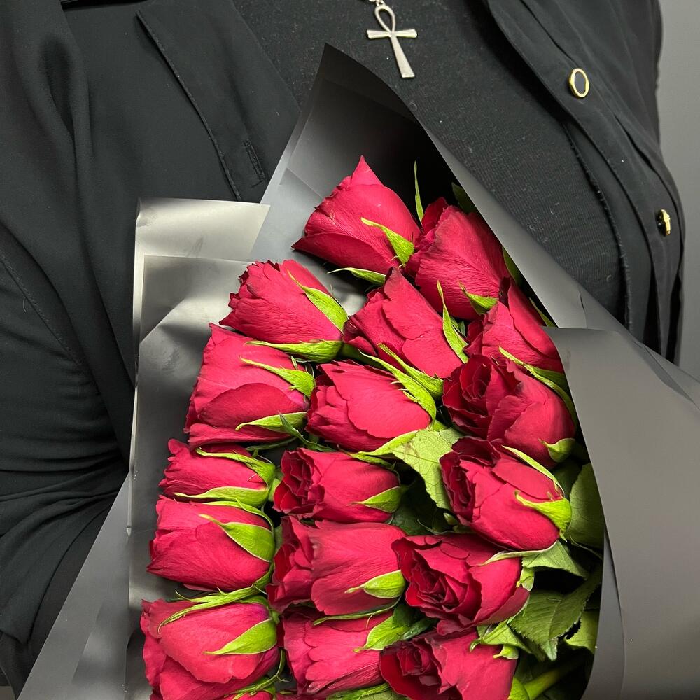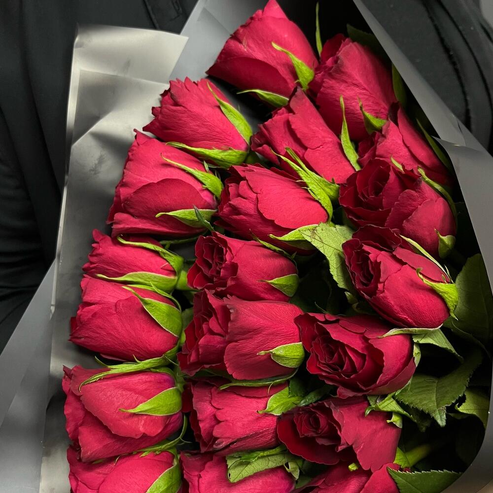 Роза красная – 20 шт.Лента атласная – 1 шт.Упаковка корейская пленка – 1 шт.