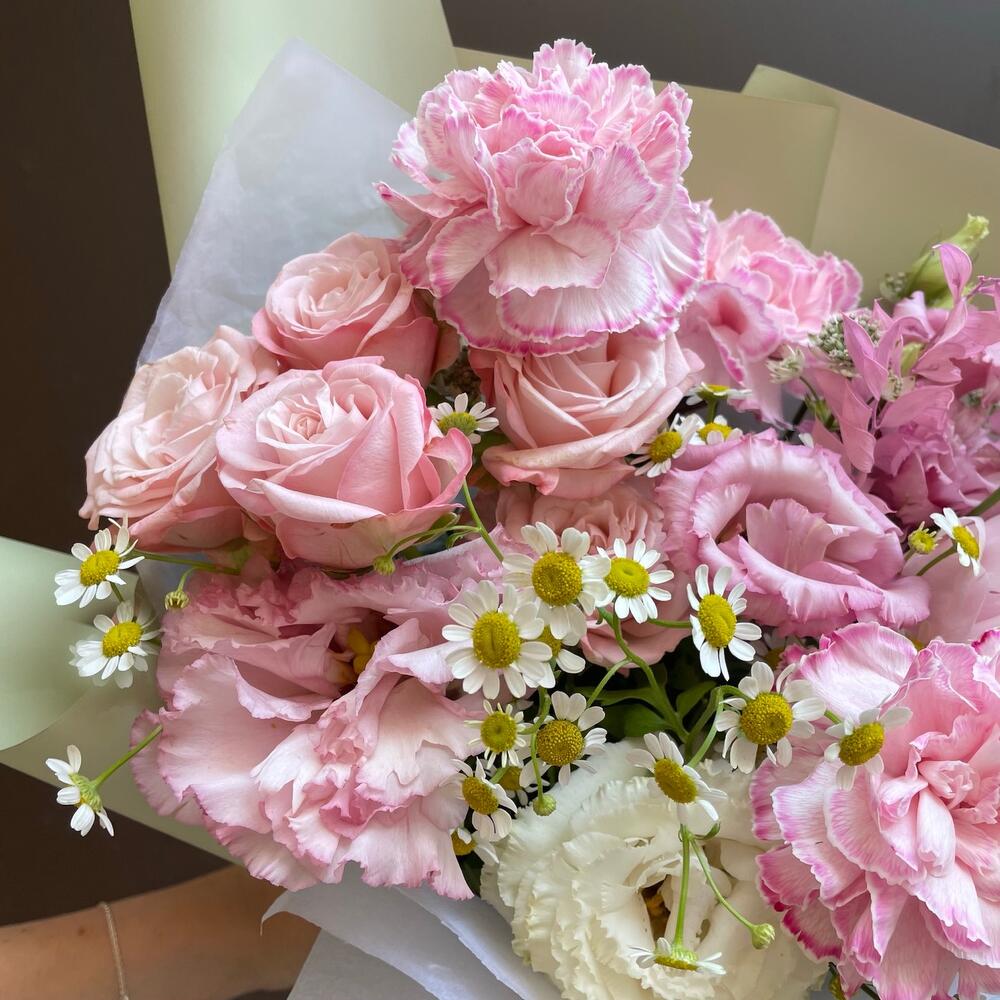 Категорий: Гвоздики, Кустовые розы, Лизиантусы, Пионовидные розы, Розы, Ромашки