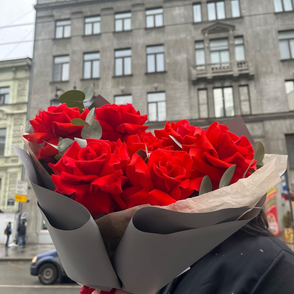 Эвкалипт – 3 шт.Лента атласная – 2 шт.Упаковка корейская пленка – 1 шт.французские розы – 7 шт.