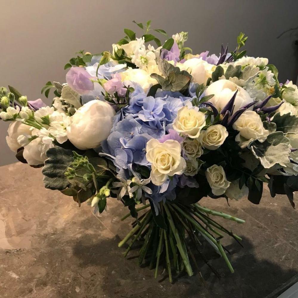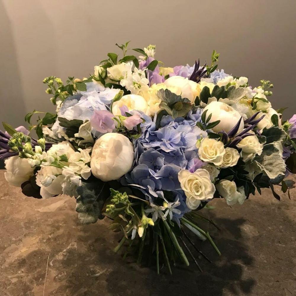 Пион – 7 шт.Гортензия – 3 шт.Роза кустовая – 7 шт.Маттиола – 7 шт.Лагурус – 5 шт.Клематис – 5 шт.Твидия – 3 шт.Сенецио – 3 шт.Фисташка – 5 шт.Эвкалипт – 5 шт.