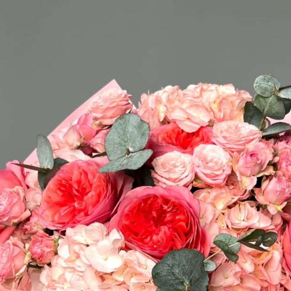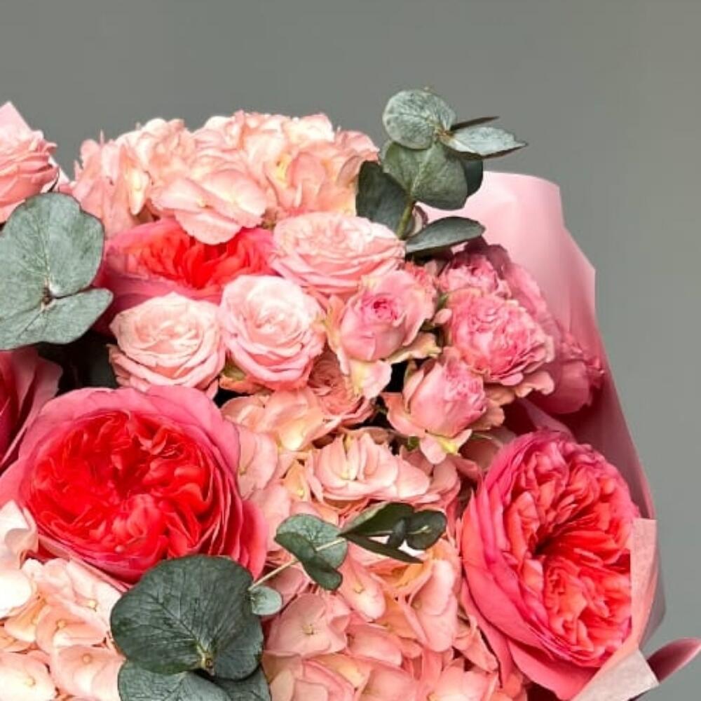 9 пионовидных роз сильва Пинк с эвкалиптом