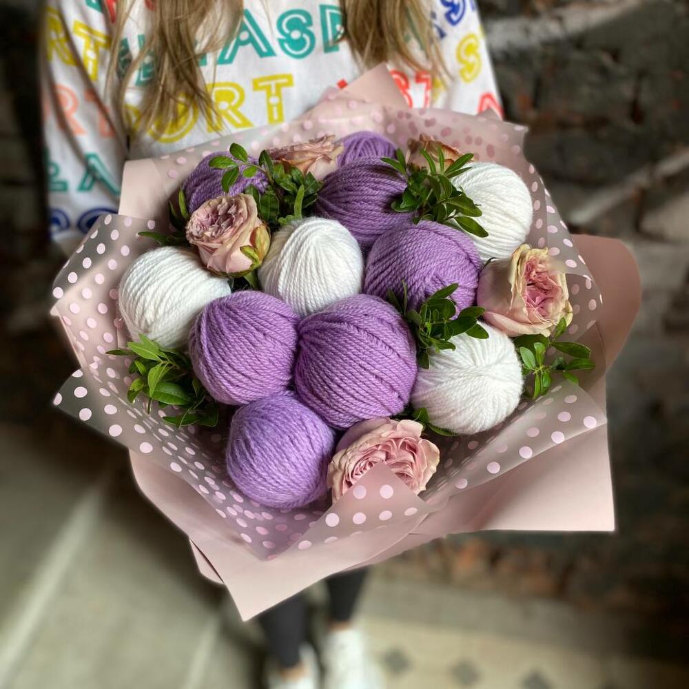 Зимний букет из клубков пряжи, роз и зелени в стильной упаковке “Альпака”