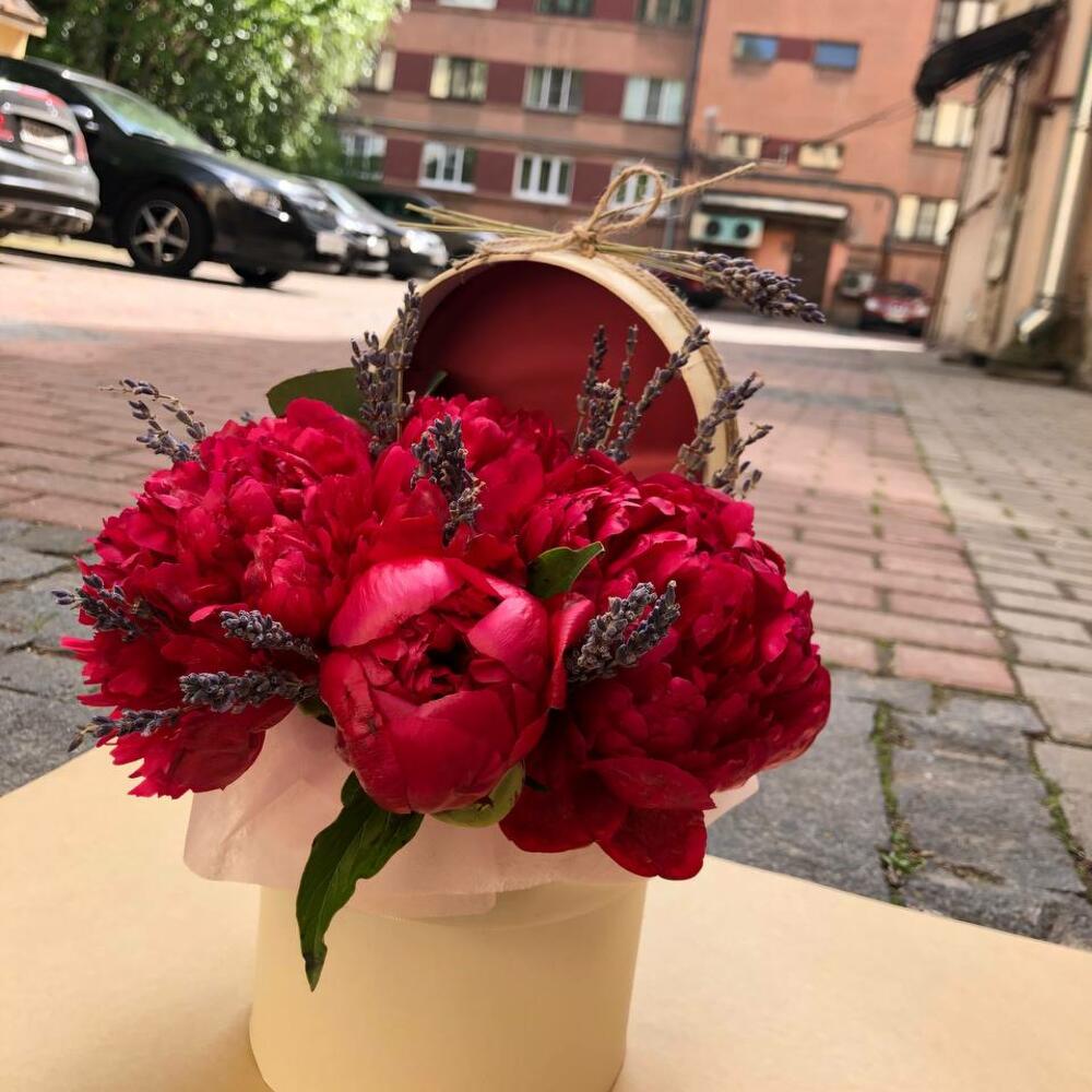 Лаванда – 15 шт.Пион Ред Шарм – 5 шт.Коробка шляпная с лентой – 1 шт.
