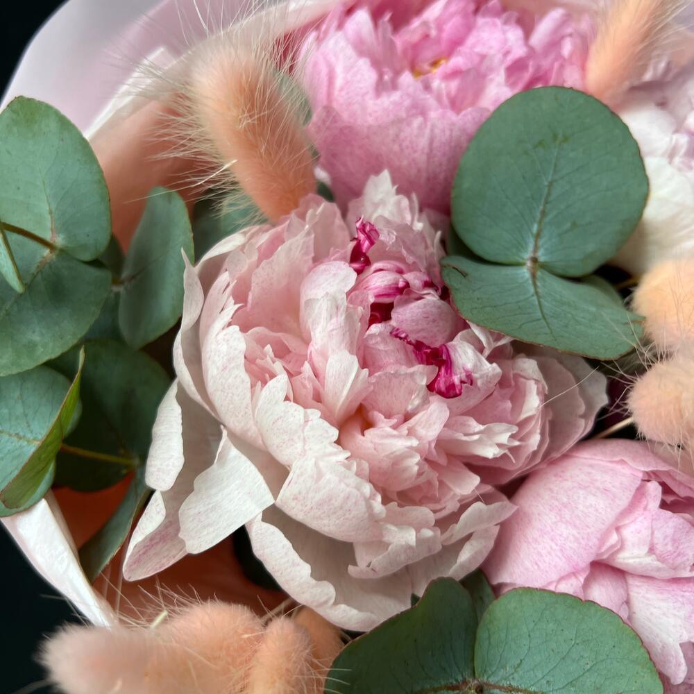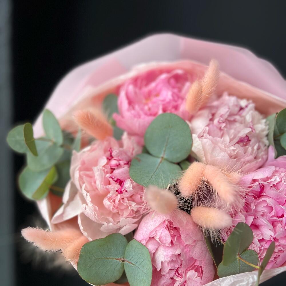 Пион – 5 шт.Лагурус – 10 шт.Эвкалипт – 3 шт.декоративная упаковка – 1 шт.Атласная лента – 1 шт.