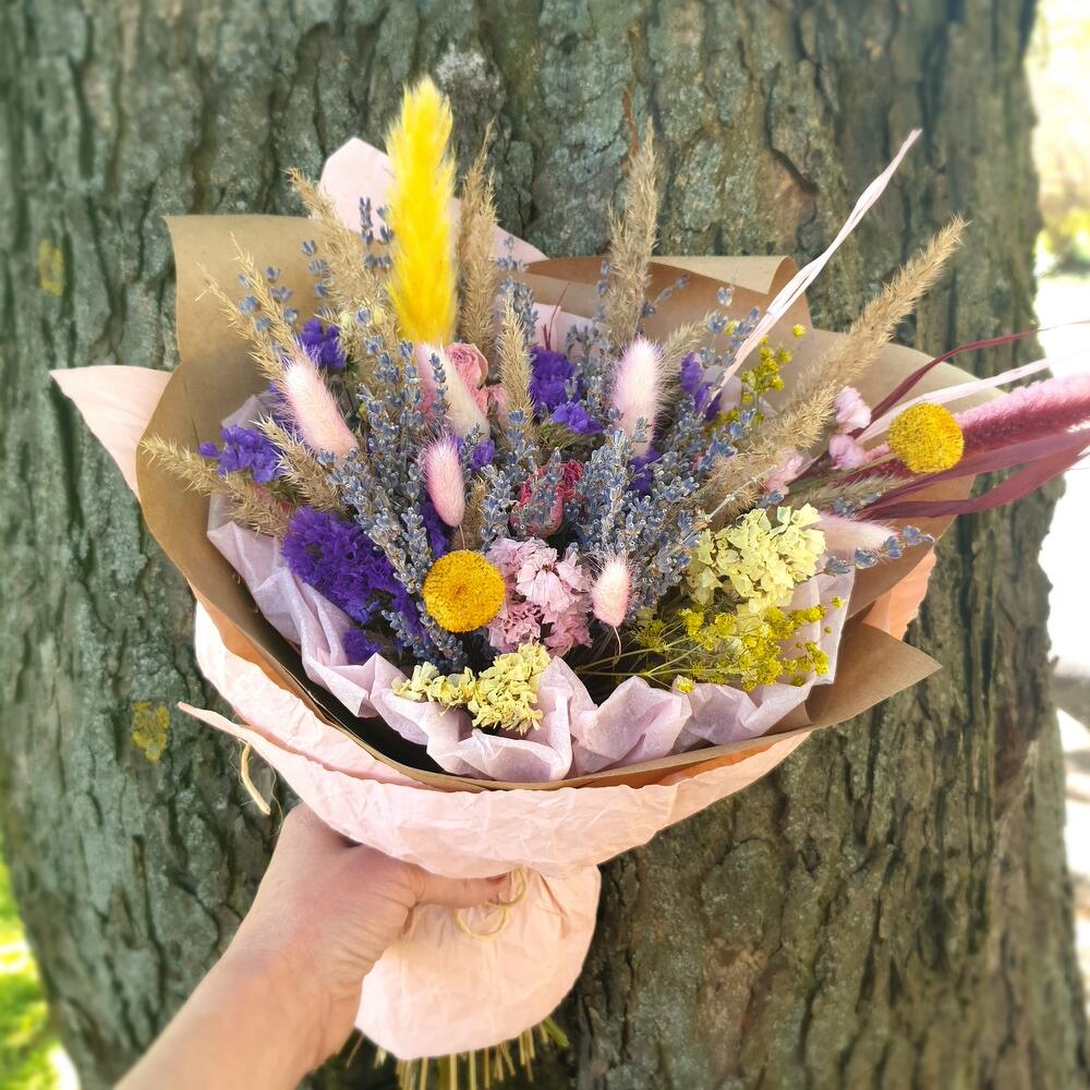 Колоски – 11 шт.Крафт упаковка – 2 шт.Лаванда (сухоцвет) пучок – 1 шт.Шпагат джутовый – 1 шт.гипсофила сухоцвет ветка – 1 шт.лагурус (сухоцвет) розовый – 7 шт.статица синяя сухоцвет – 3 шт.статица желтая сухоцвет – 2 шт.розы сухоцвет микс – 3 шт.краспедия желтая сухоцвет – 2 шт.статица розовая сухоцвет – 1 шт.