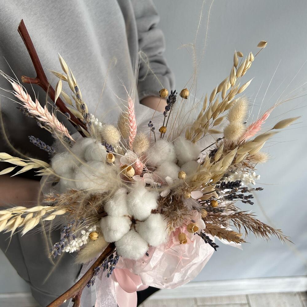 Композиция из сухоцветов с хлопком и лавандой