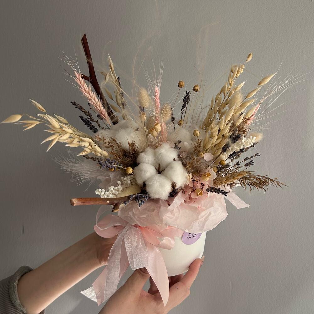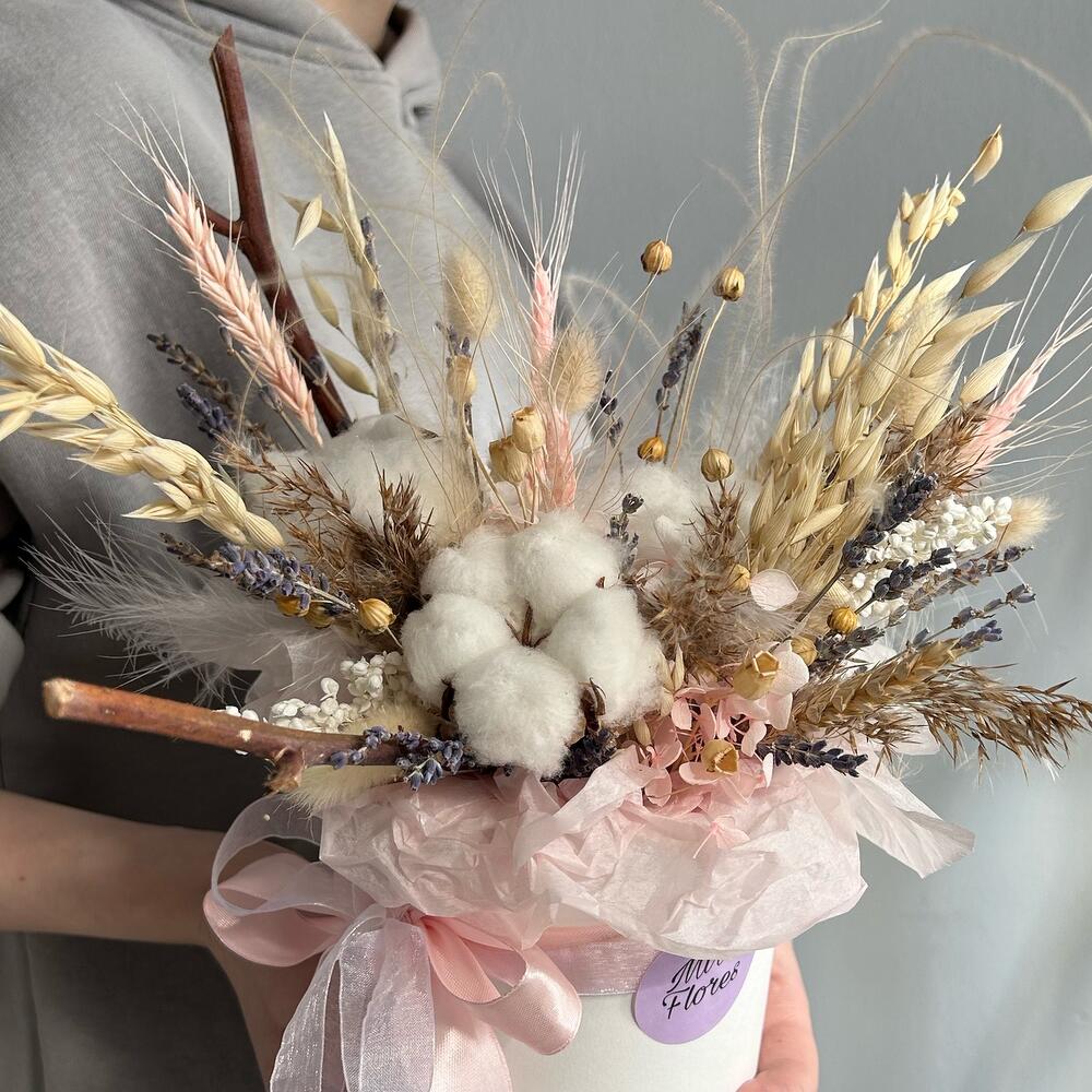 Хлопок натуральный – 3 шт.гортензия стабилизированная пучок – 2 шт.Лаванда (сухоцвет) – 25 шт.лен сухоцвет – 1 шт.овес сухоцвет – 6 шт.Лагурус – 8 шт.Пшеница – 4 шт.сорго – 3 шт.сухие цветы – 6 шт.Ковыль – 1 шт.Оазис флористический – 1 шт.Коробка шляпная – 1 шт.перья декоративные – 4 шт.