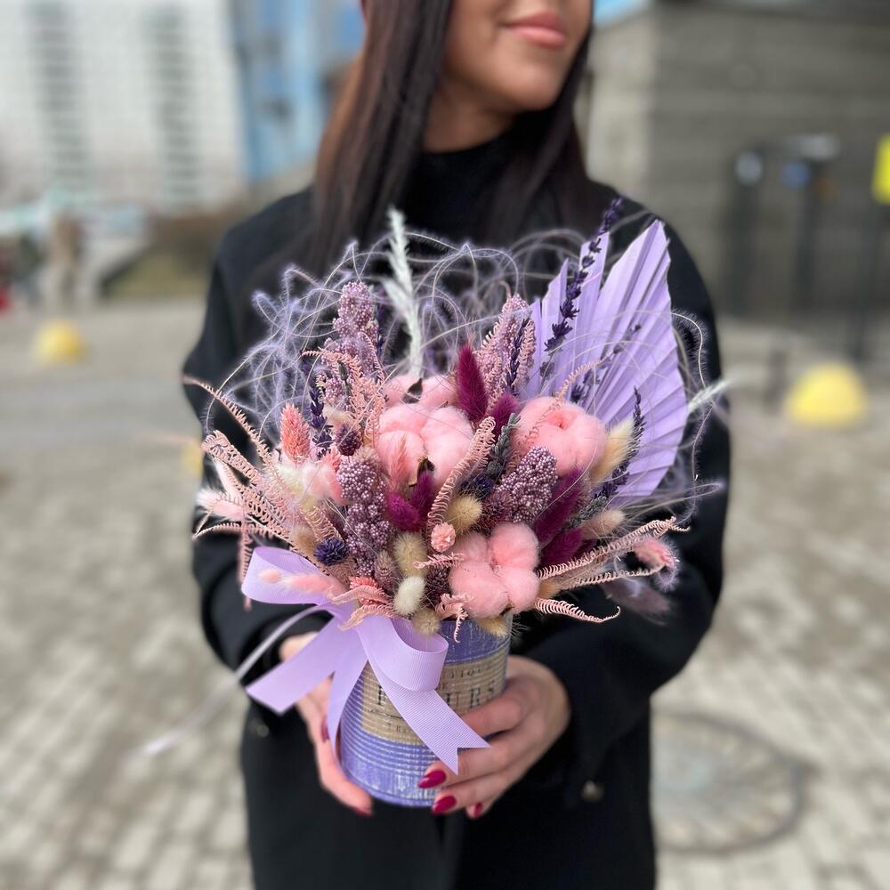 Кашпо – 1 шт.Лента атласная – 2 шт.Оазис флористический – 1 шт.пальма сухоцвет – 1 шт.Стифа – 7 шт.Лаванда – 15 шт.Хлопок – 5 шт.ягоды искусственные – 5 шт.Лагурус – 65 шт.