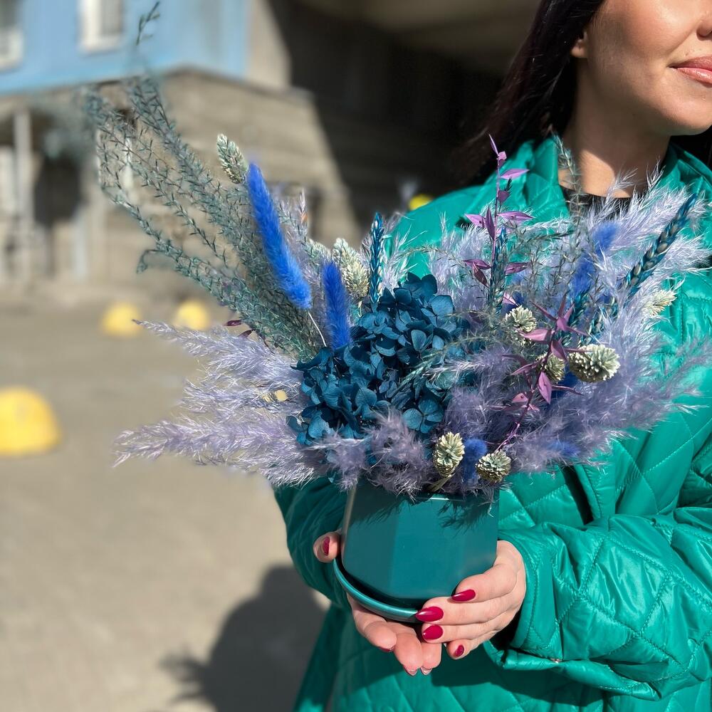 Гортензия – 1 шт.Пшеница – 6 шт.Лагурус – 10 шт.Кашпо керамическое – 1 шт.Фаларис – 16 шт.Оазис для сухоцветов – 1 шт.овес сухоцвет – 2 шт.кортадерия – 3 шт.мискантус – 1 шт.