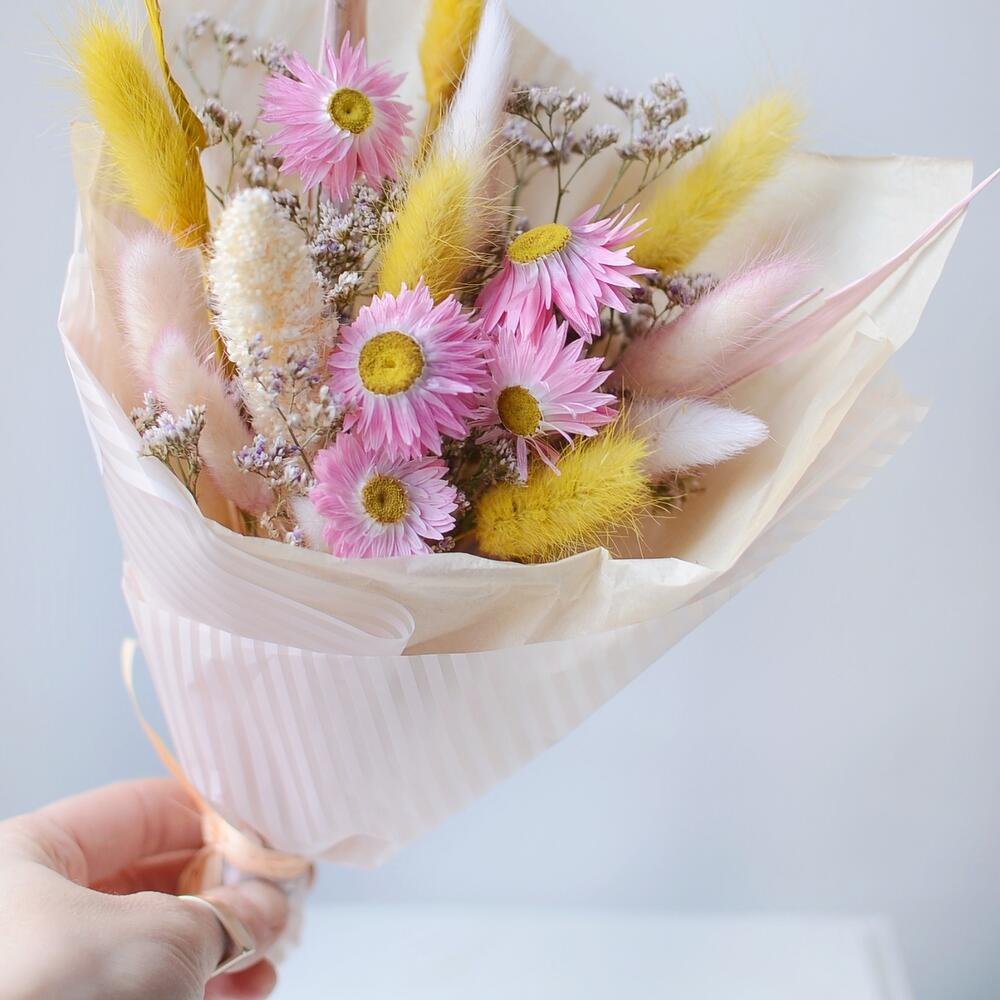 Упаковка дизайнерская – 1 шт.Сетария – 1 шт.лимониум пучок – 1 шт.акроклинум – 5 шт.лагурус микс пучок – 1 шт.