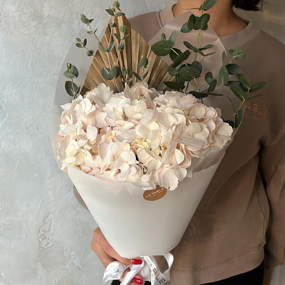 Гортензия розовая – 1 шт.Эвкалипт – 1 шт.Сухоцвет – 1 шт.Упаковка дизайнерская – 1 шт.