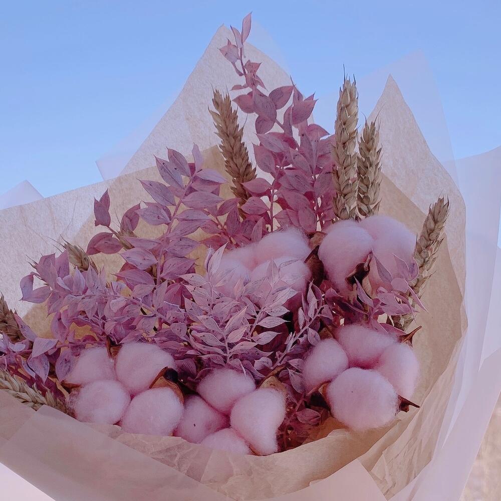 Лента атласная – 1 шт.Колоски – 10 шт.Упаковка дизайнерская – 1 шт.Инструкция по уходу – 1 шт.хлопок розовый – 5 шт.рускус сухоцвет крашенный – 2 шт.