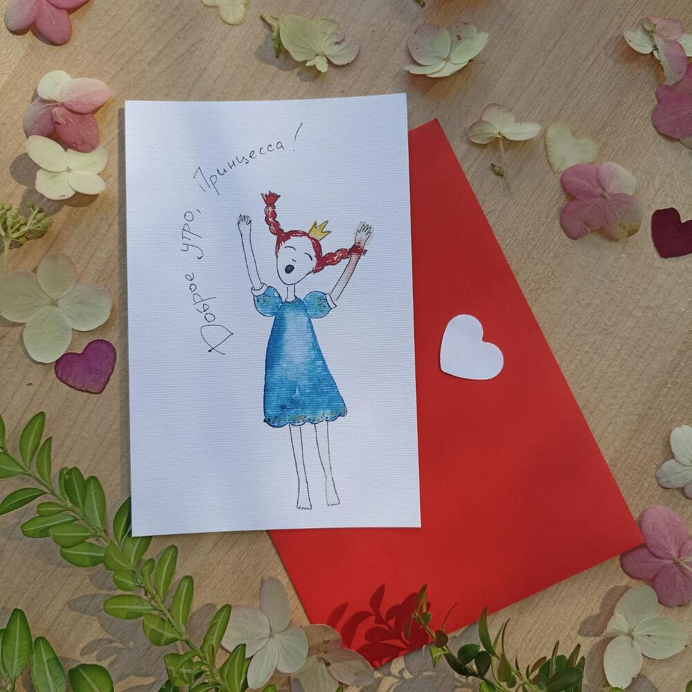 Открытка с любовью нарисована художником акварелью и отпечатана на плотной бумаге. Таких открыток нет нигде, кроме нашего магазина К каждой открытке Вы можете прислать текст в чат, который мы напечатаем в нескольких вариантах. Вы сможете выбрать тот шрифт, который Вам больше по душе, а мы аккуратно приклеим его к открытке.Открытку доставляем в ярком красном конверте, заклеенном сердечком, а внутрь кладём сухоцветы – сердечки из лепестков, лепестки, цветы и пару наклеек-сердечек❤Ждём Ваш текст для открытки в чате