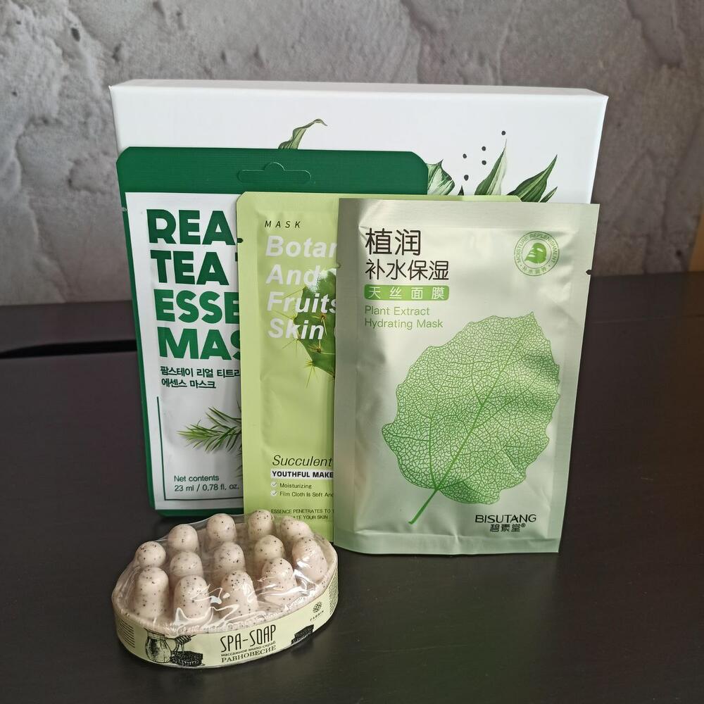 Коробка подарочная – 1 шт.свеча ароматическая лаванда и базилик – 1 шт.маска тканевая для лица – 3 шт.массажное мыло-скраб – 1 шт.расслабляющая соль для ванной с лепестками душицы – 1 шт.