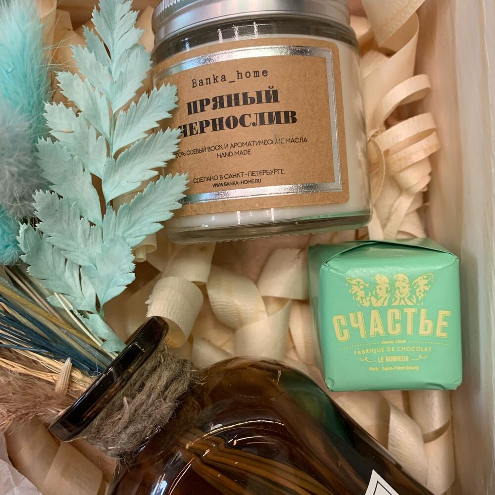 Ящик деревянный ручной работы – 1 шт.Ваза стекло – 1 шт.букетик из сухоцветов – 1 шт.свеча banca home в ассортименте – 1 шт.бомбочка для ванной из натуральных масел « – 1 шт.бомбочка для ванной ручной работы из натуральных масел – 1 шт.конфеты счастье 50г – 2 шт.