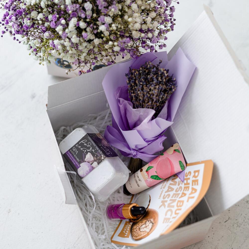Гипсофила – 5 шт.коробка зайка – 1 шт.Тишью – 4 шт.Оазис флористический – 1 шт.маска для лица корея farm stay – 1 шт.Крем для рук – 1 шт.масло для кутикулы – 1 шт.бомбочки для ванной набор – 1 шт.Коробка подарочная – 1 шт.Наполнитель бумажный – 1 шт.Лента атласная – 1 шт.Упаковка транспортировочная пленка – 1 шт.инструкция по уходу за цветами – 1 шт.букет лаванда – 1 шт.