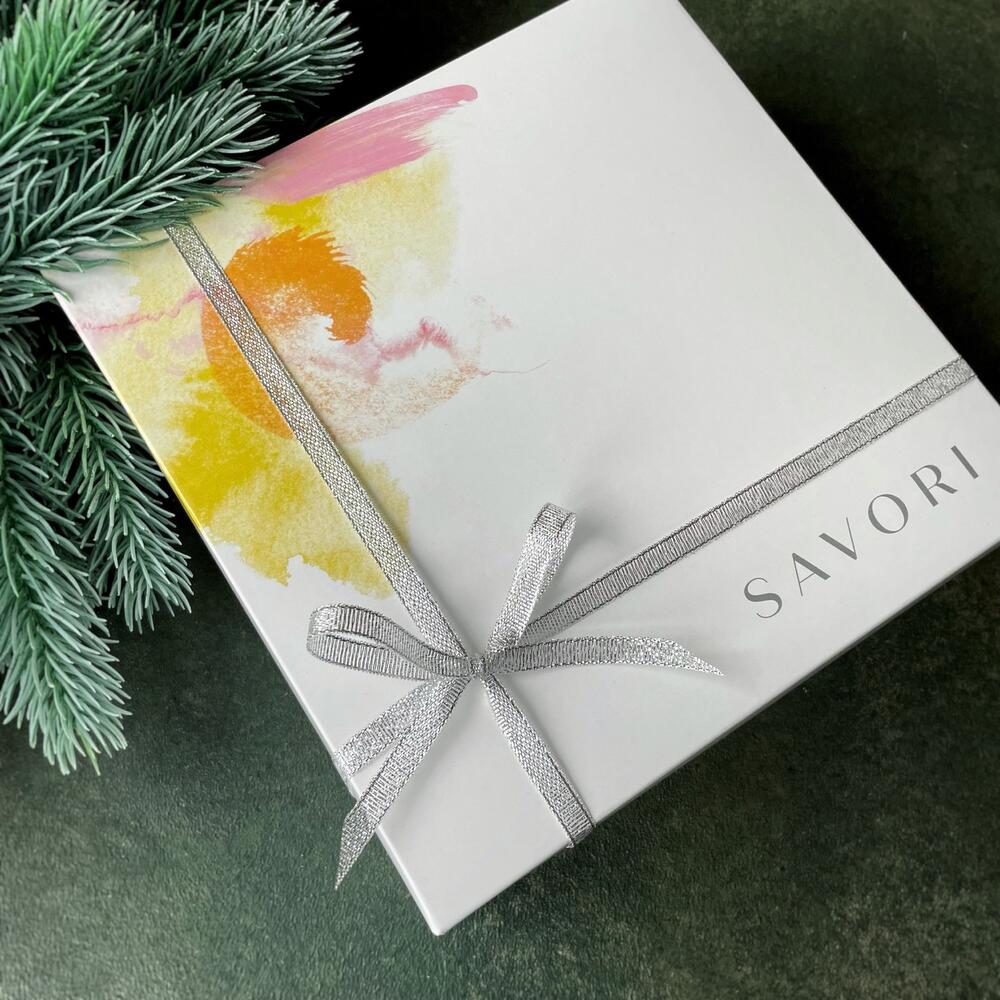 чай черный таежный – 40 гр.чай зеленый жасминовая снежинка – 40 гр.Шоколадные батончики – 1 шт.миндаль в меду – 1 шт.букет сухоцветов – 1 шт.коробка savori – 1 шт.