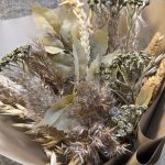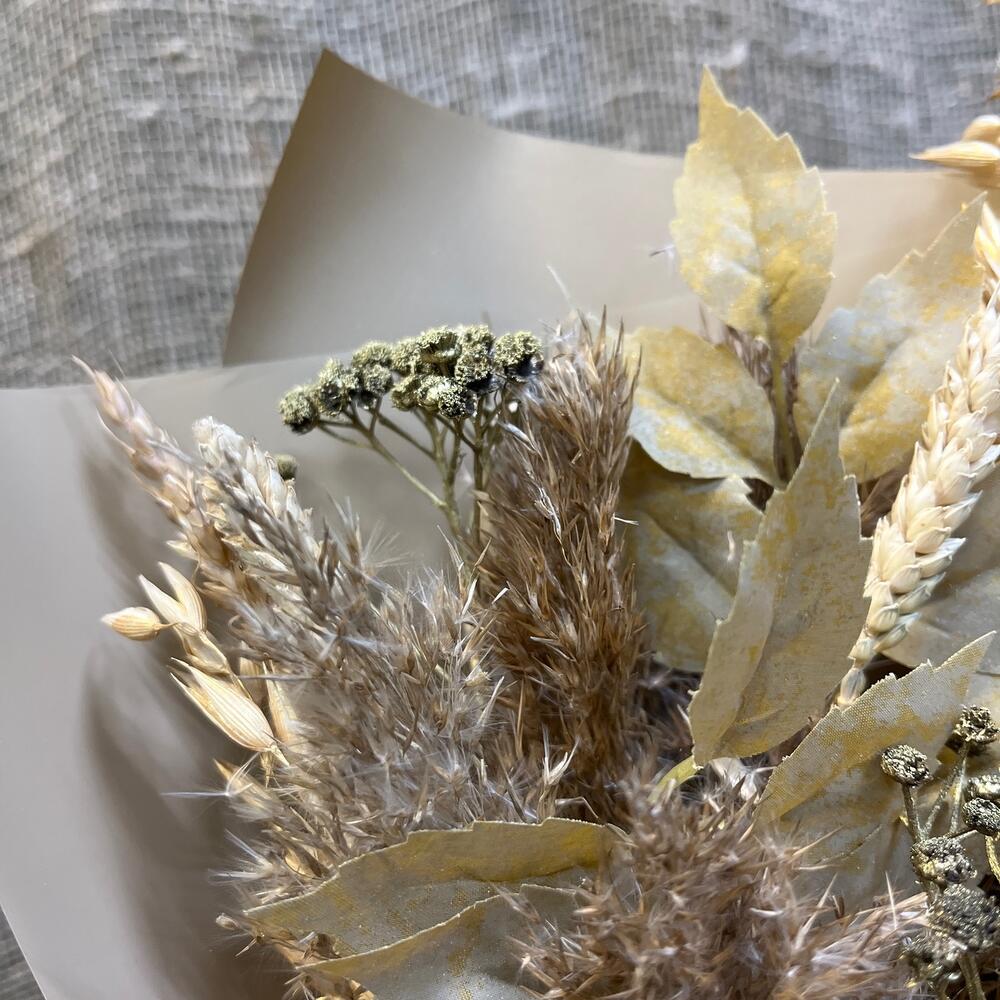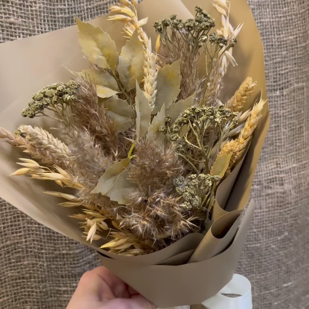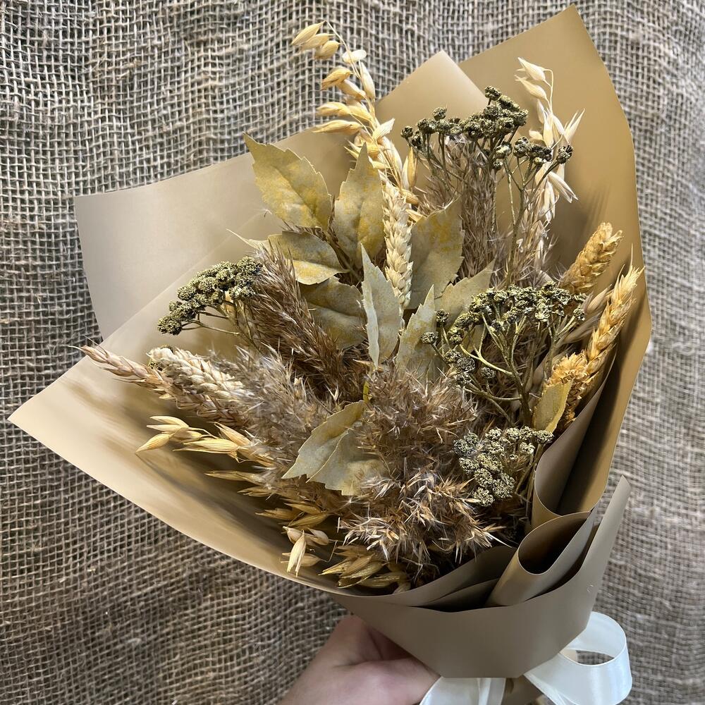 Букет из различных сухоцветов форм в корейской упаковке и атласной лентой. Природные формы гармонично перекликаются в букете.