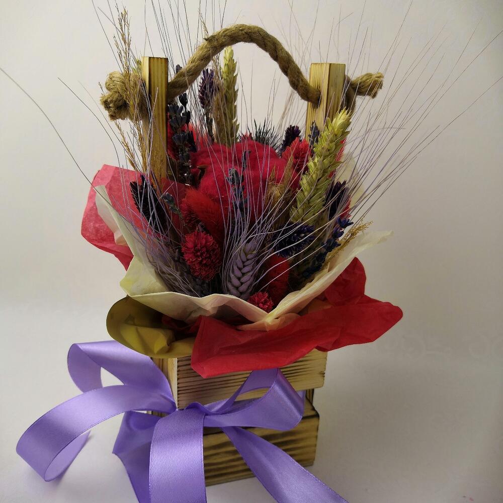 Лагурус – 19 шт.Хлопок – 1 шт.Лаванда (сухоцвет) – 11 шт.Пшеница (сухоцвет) – 8 шт.Тишью – 1 шт.Ящик – 1 шт.Лента атласная – 1 шт.Оазис – 1 шт.