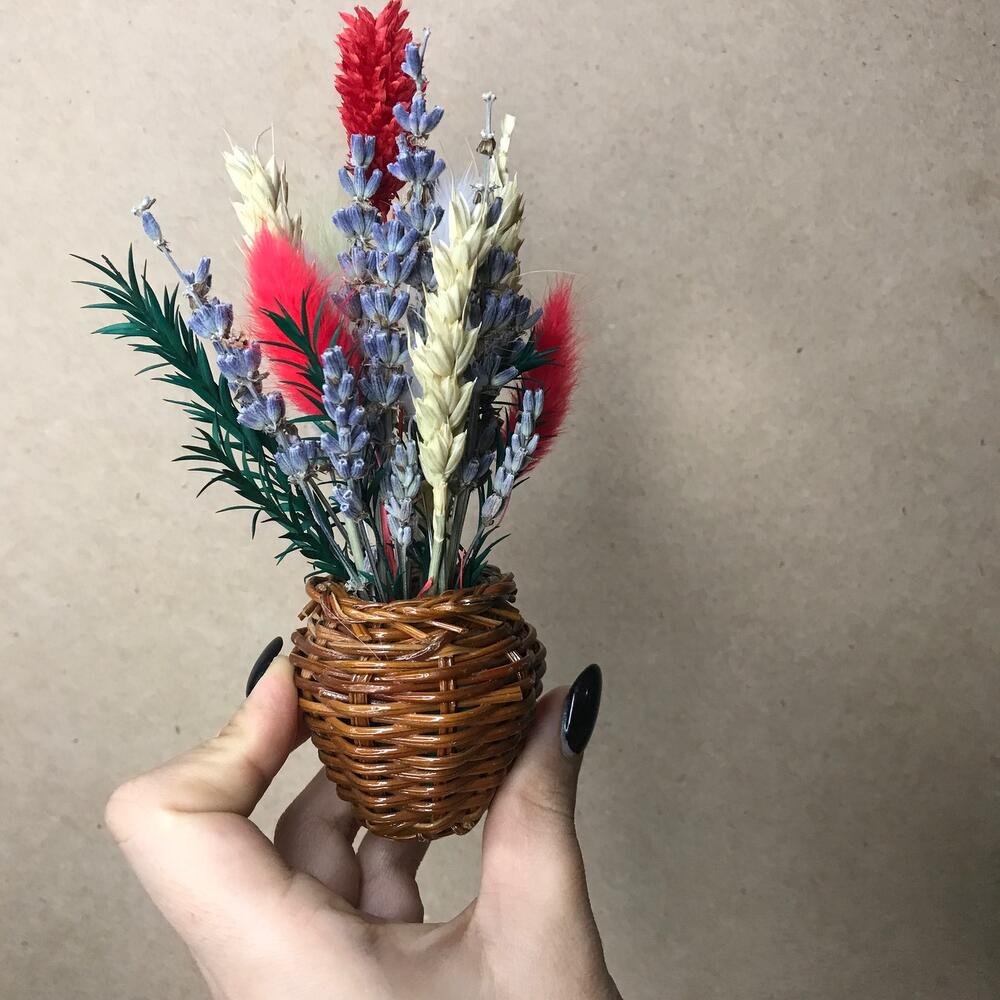 фаларис сухоцвет – 1 шт.Пшеница (сухоцвет) – 3 шт.Лагурус (сухоцвет) – 5 шт.чайное дерево стабилизированное – 4 шт.Лаванда (сухоцвет) – 9 шт.Корзина плетеная – 9 шт.