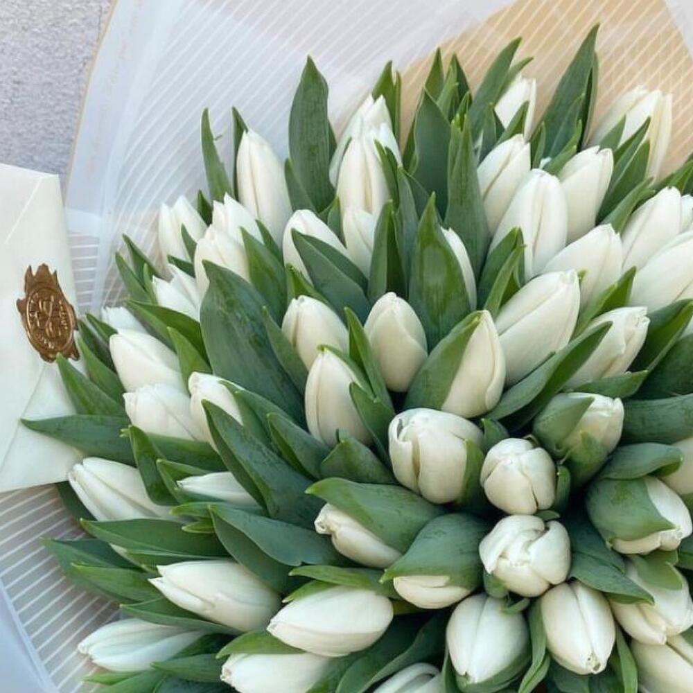 Тюльпан белый – 51 шт.Упаковка дизайнерская – 2 шт.Лента атласная – 2 шт.Открыточка с вашими пожеланиями – 1 шт.хорошее настроение – 100 шт.инструкция по уходу за цветами – 1 шт.коробка переноска – 1 шт.Кризал – 1 шт.