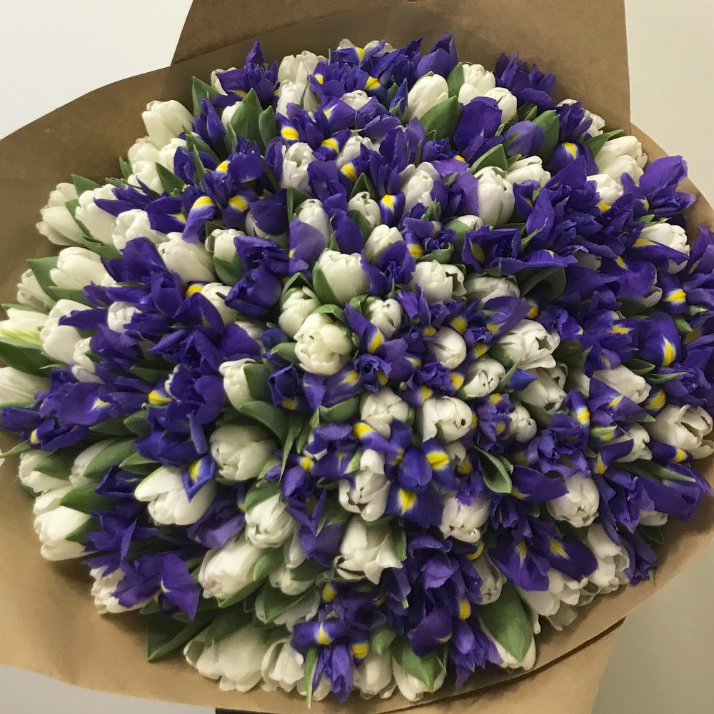 Букет из ирисов и тюльпанов "White Blue"
