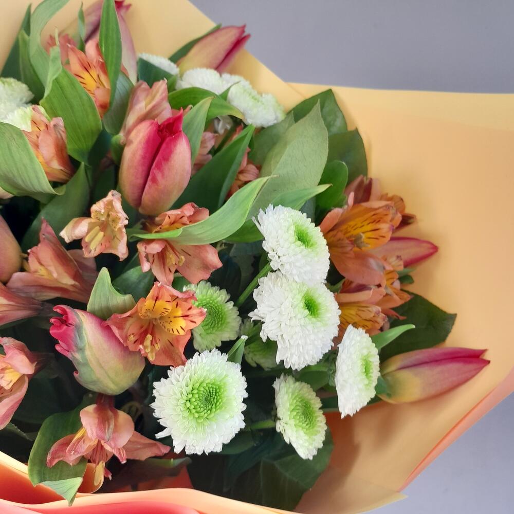 Букет из тюльпанов, альстромерии и сантини