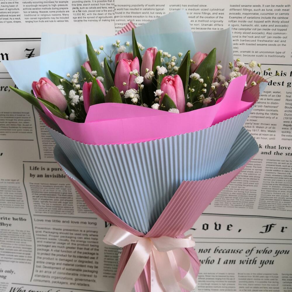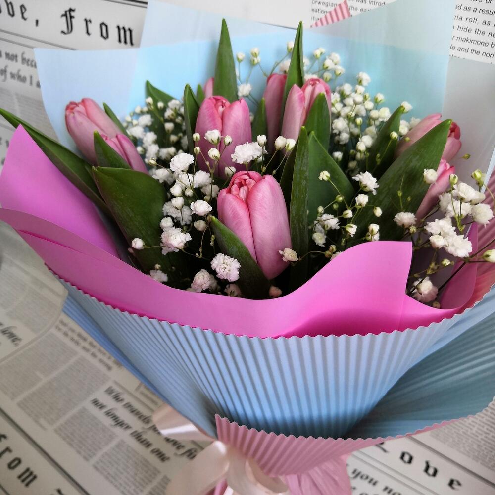Тюльпан – 9 шт.Гипсофила – 2 шт.Упаковка дизайнерская – 1 шт.